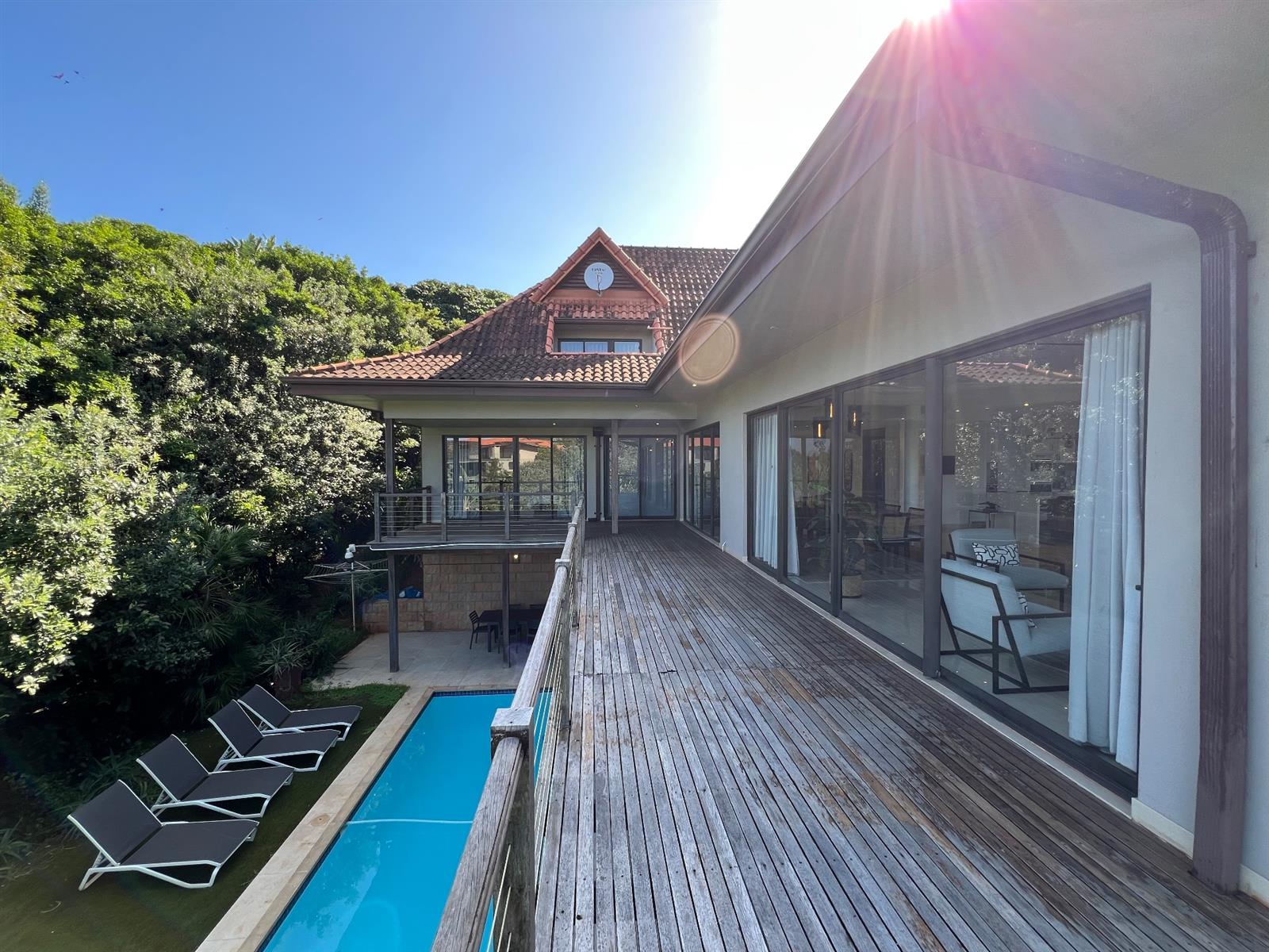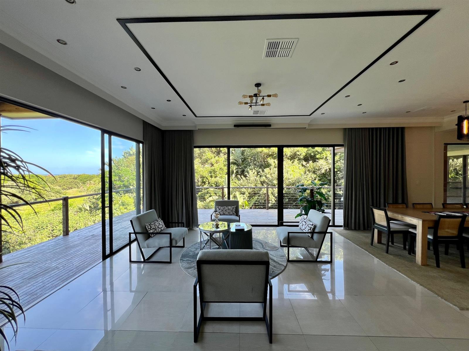 The entry level features four automated garages, providing ample accommodation for luxury vehicles. The main living level showcases expansive open-plan living and dining areas, enhanced by integrated surround-sound ceiling speakers and a ceiling-mounted drop-down projector, creating a seamless indoor entertainment experience. These spaces flow onto a wrap-around wooden deck, ideal for sunset entertaining.