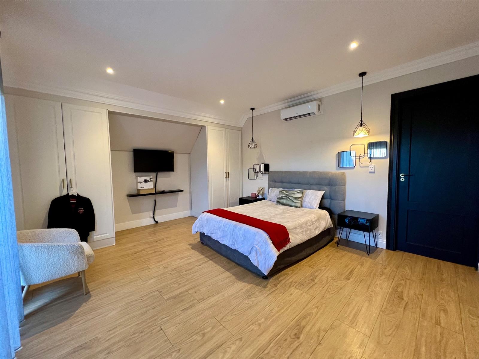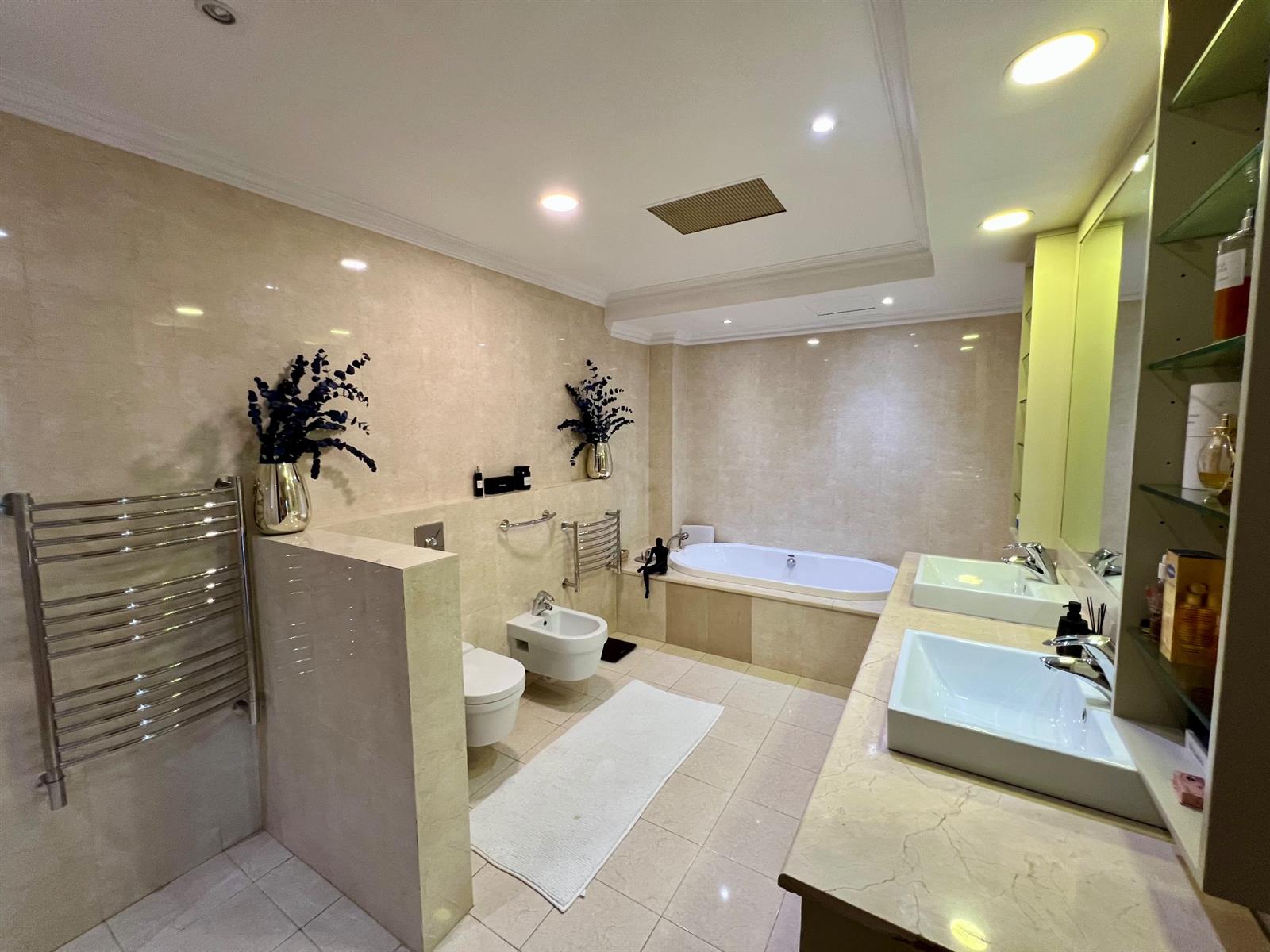 The main bedroom suite, located on this level, offers a private retreat with an oversized dressing area and a luxurious en-suite bathroom. A striking spiral staircase leads to the upper level, which comprises two well-appointed en-suite bedrooms and a fully fitted home theatre room.