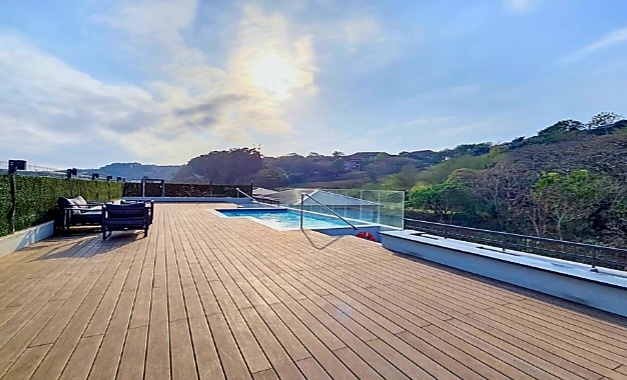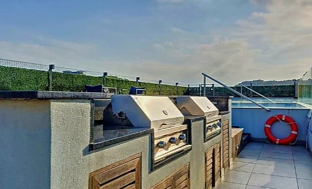 A rooftop entertainment deck with pool, braai facilities & lounging areas