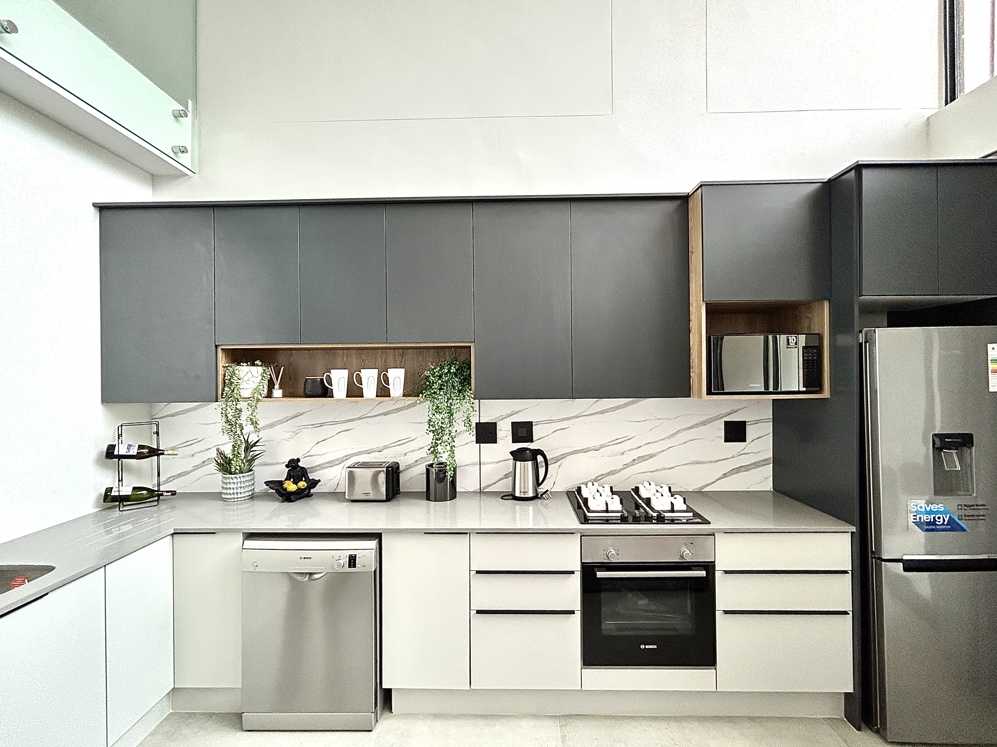 The double volume central living, dining and entertainment areas are stylishly integrated with the gourmet kitchen overlooking spacious balcony. Two sun-dappled bedrooms with their shared bathroom are conveniently located on this first floor level. A stylish staircase leads upstairs into a cosy study and expansive master bedroom with its en-suite bathroom.
