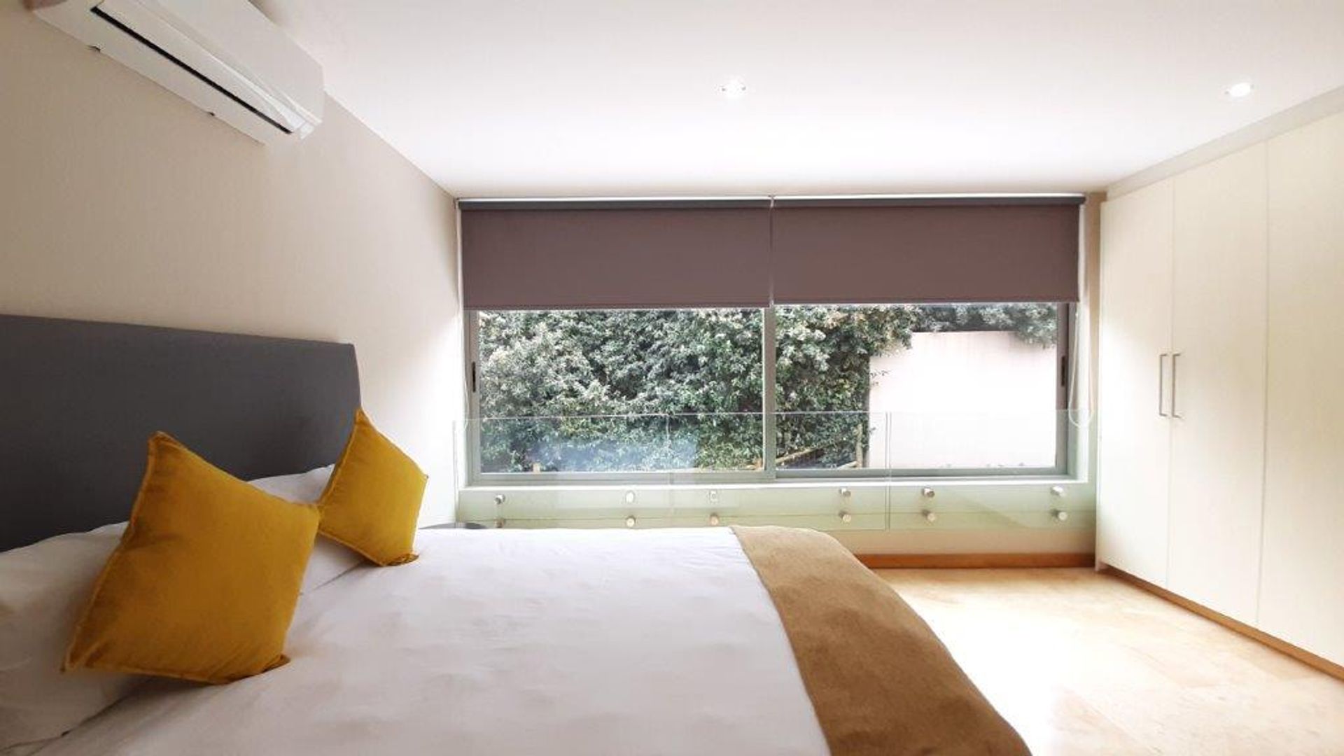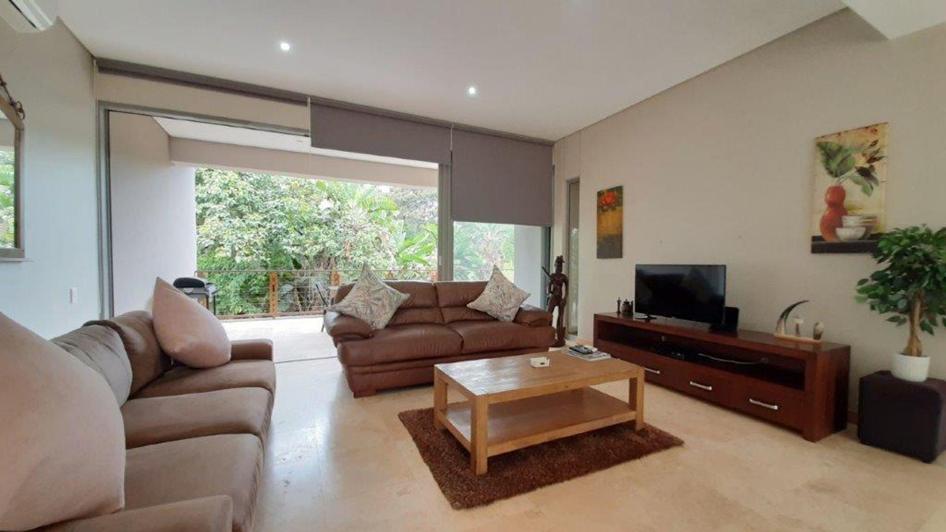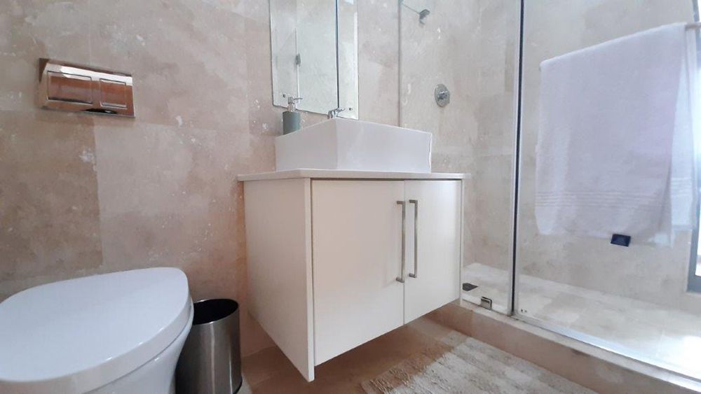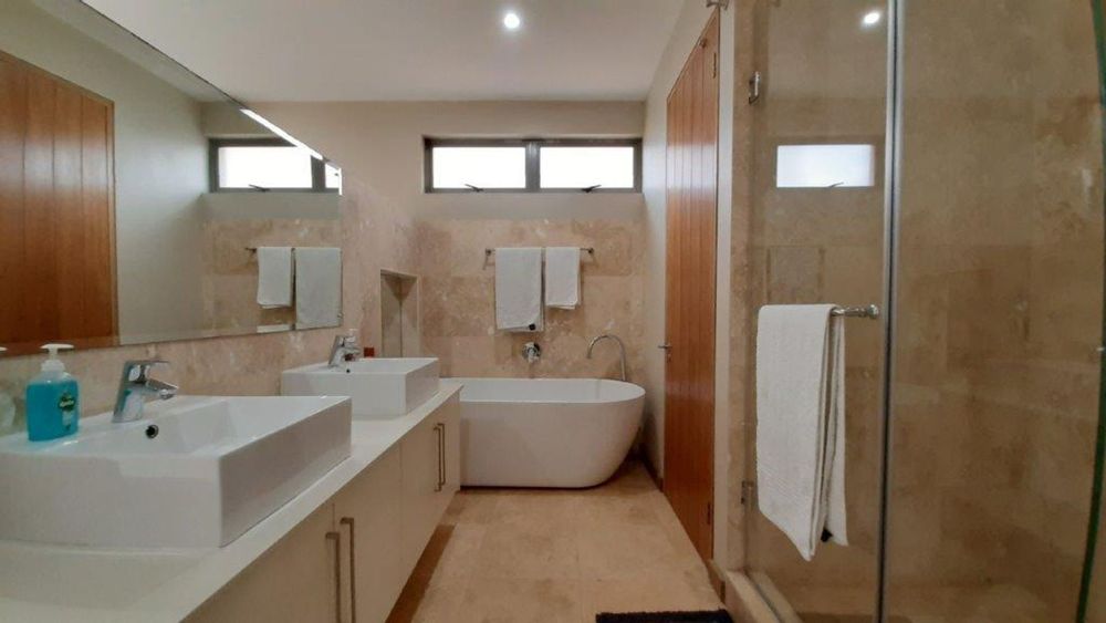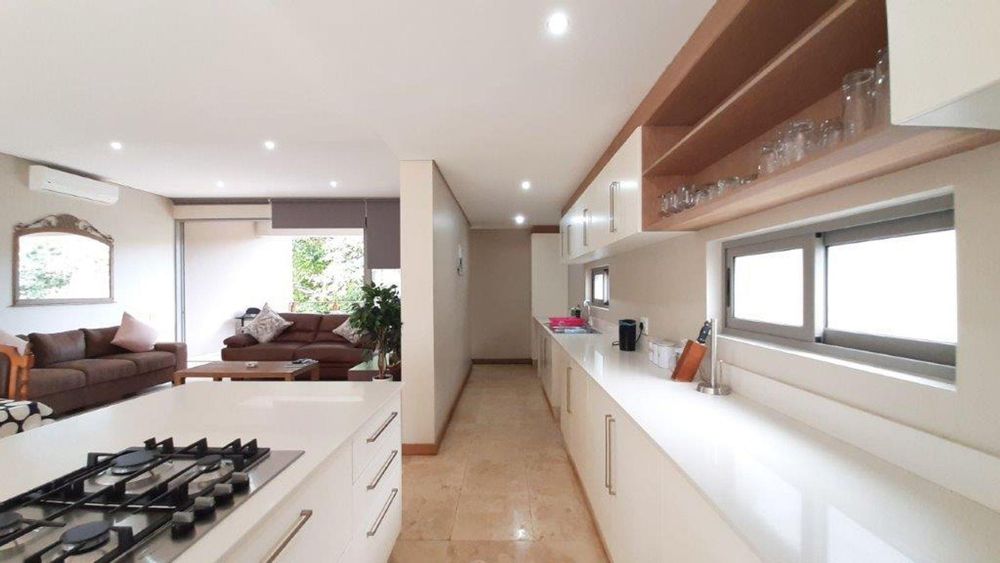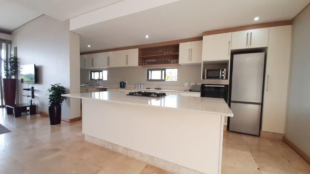 The open plan layout is elegant and sophisticated in its decor and large expanses of glass doors to maximize those breathtaking views. The elegant kitchen is spacious and fitted with Caesarstone countertops, ample cabinetry, a Bosch gas hob and electric oven, a kitchen island with a breakfast nook, and a separate scullery.