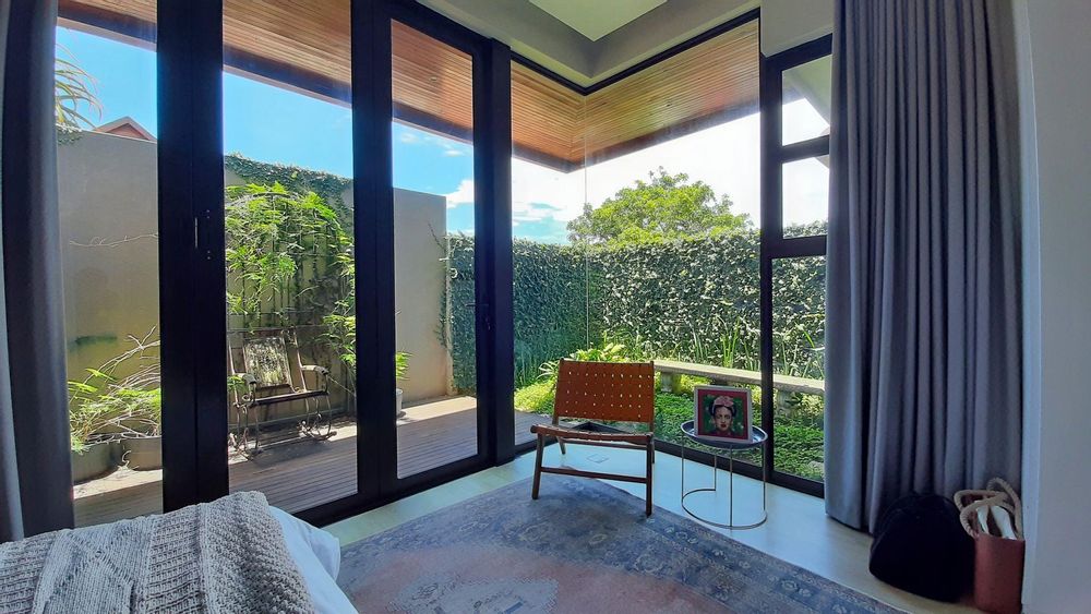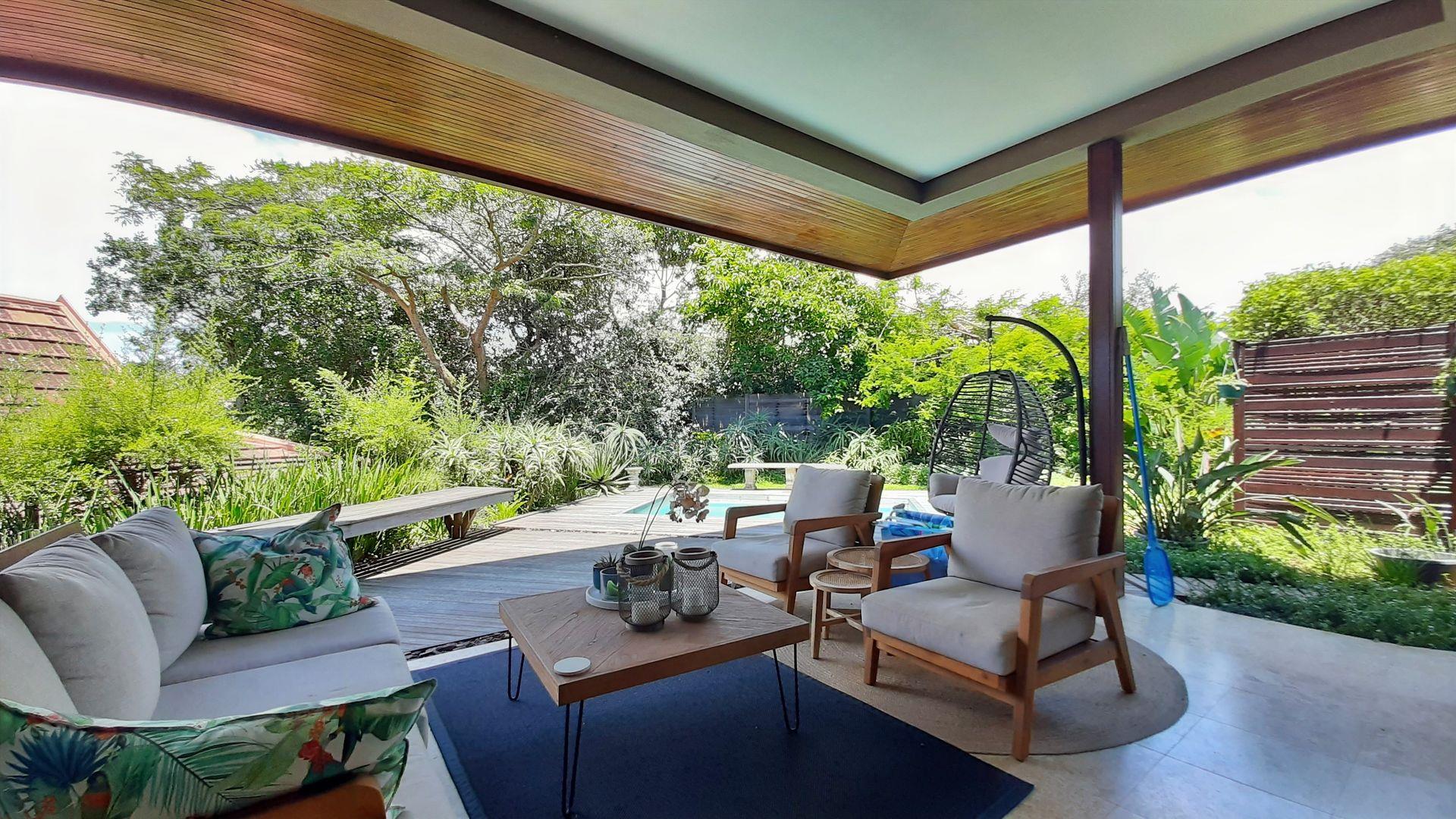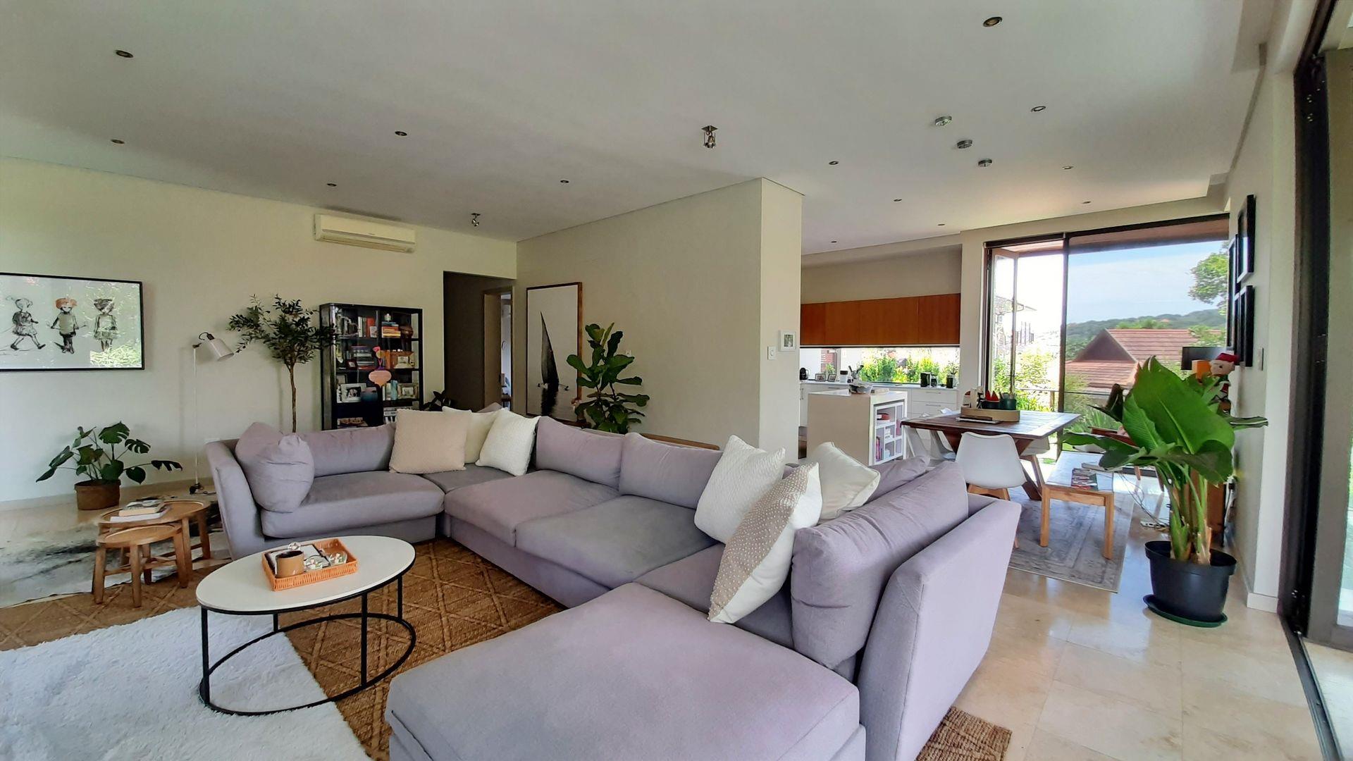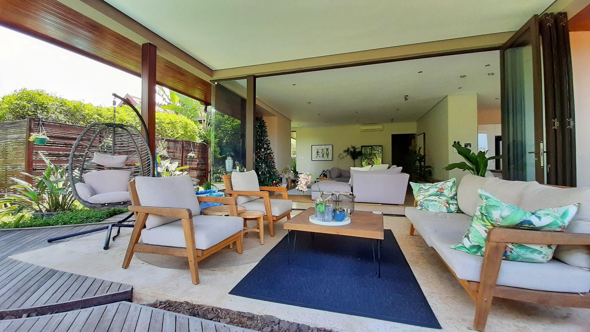 The main bedroom, a true private sanctuary, opens up to a meticulously manicured garden that mirrors the tranquillity of Zimbali Estate. All three bedrooms offer en-suite luxury, providing the utmost comfort and privacy.