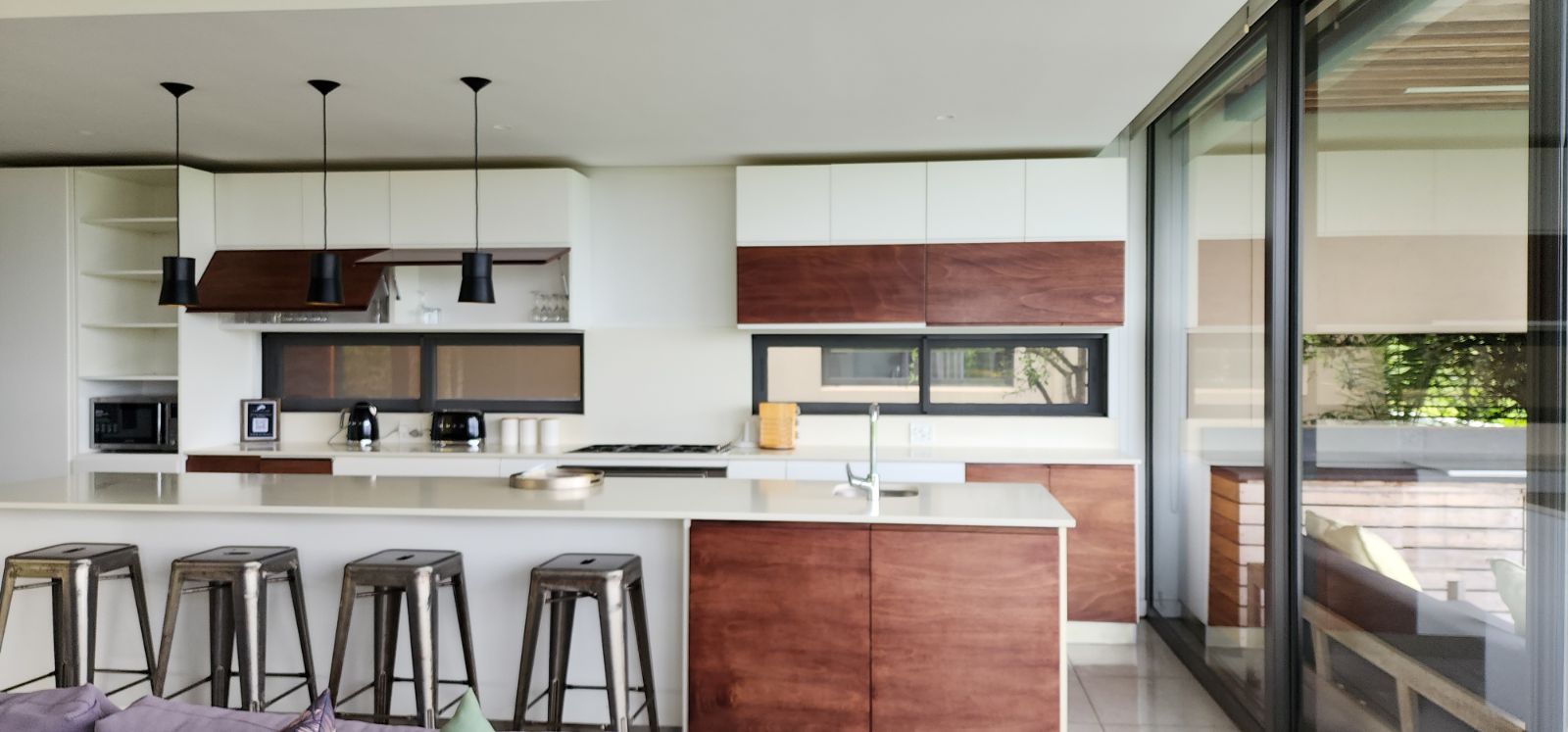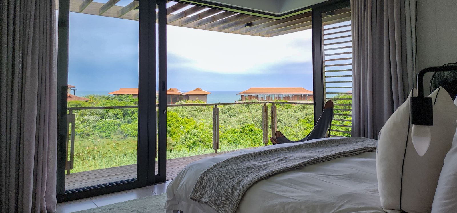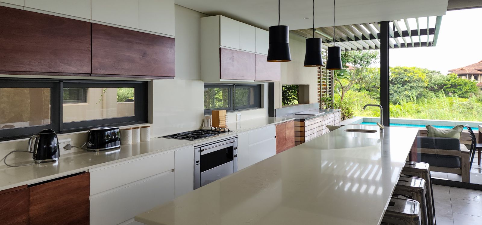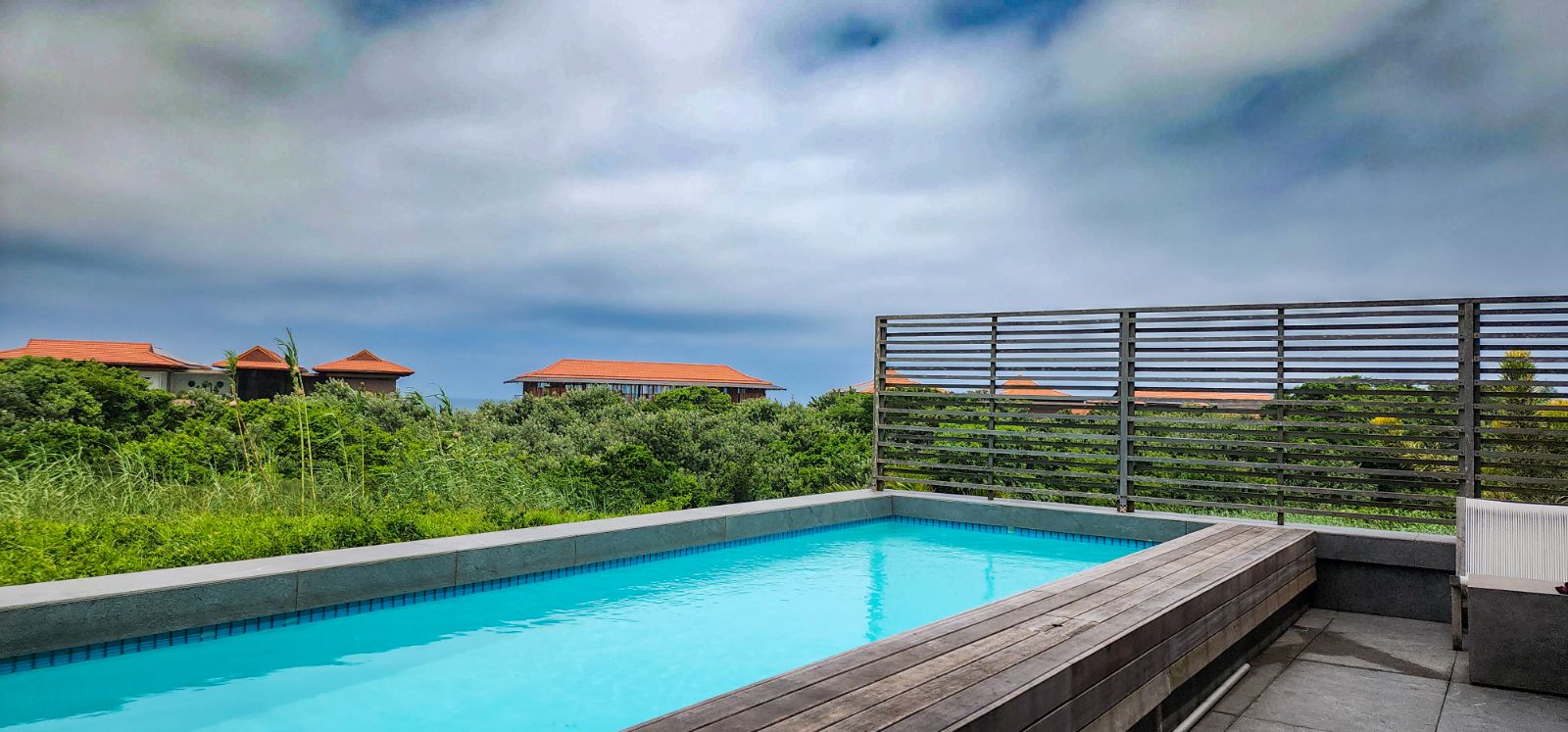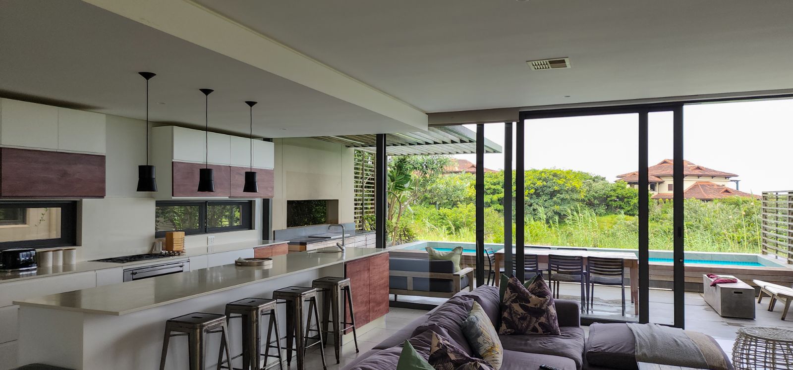 On the entry-level, you’ll find four generous bedrooms. Two of these bedrooms boast luxurious sea-facing balconies, perfect for soaking in the breathtaking views. The other two bedrooms are equally comfortable and share a stylish family bathroom. If you’re looking for privacy and tranquillity, the living area is conveniently located on the lower ground level. The living area is open-plan that opens to the pool and wooden deck with build-in braai. The kitchen has a huge centre island and is equipped with state-of-the-art equipment. The scullery/laundry adds to the convenience of this wonderful duplex unit.