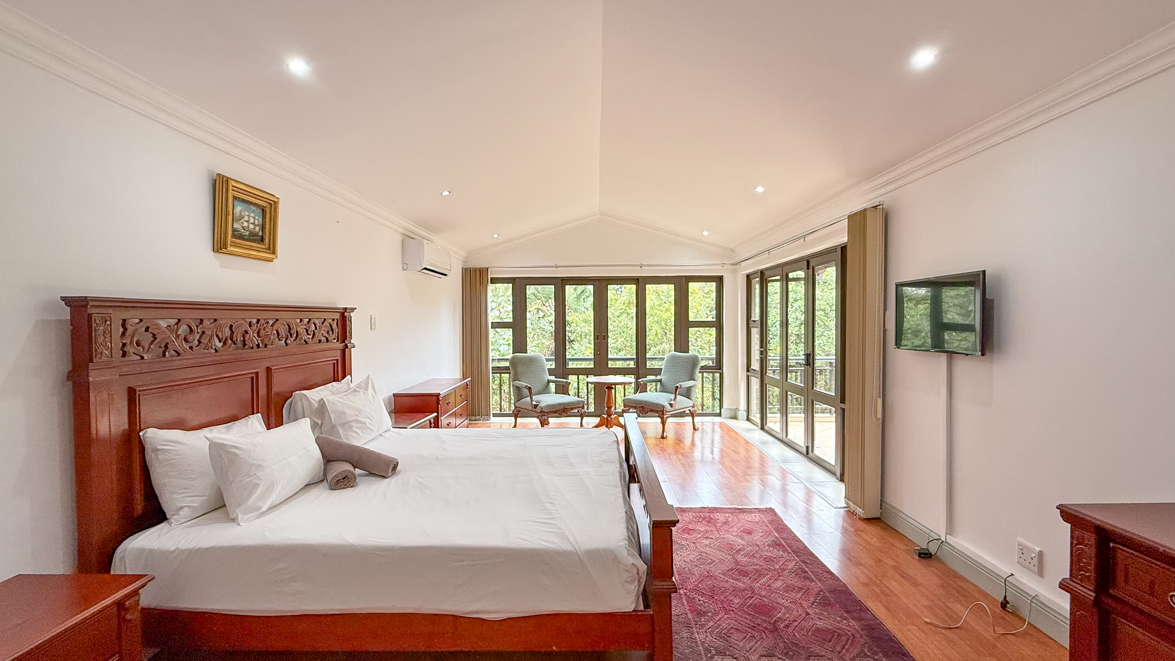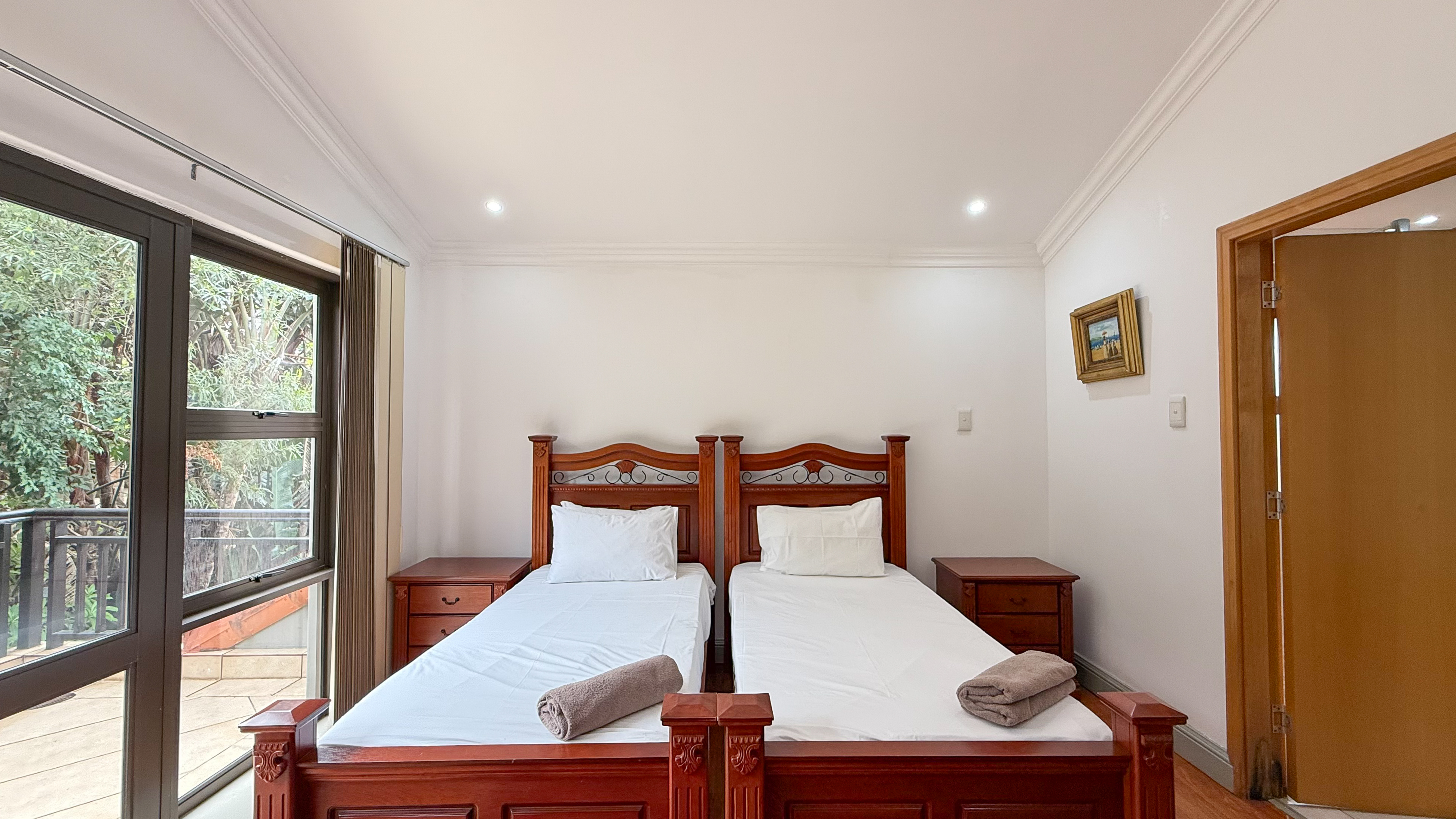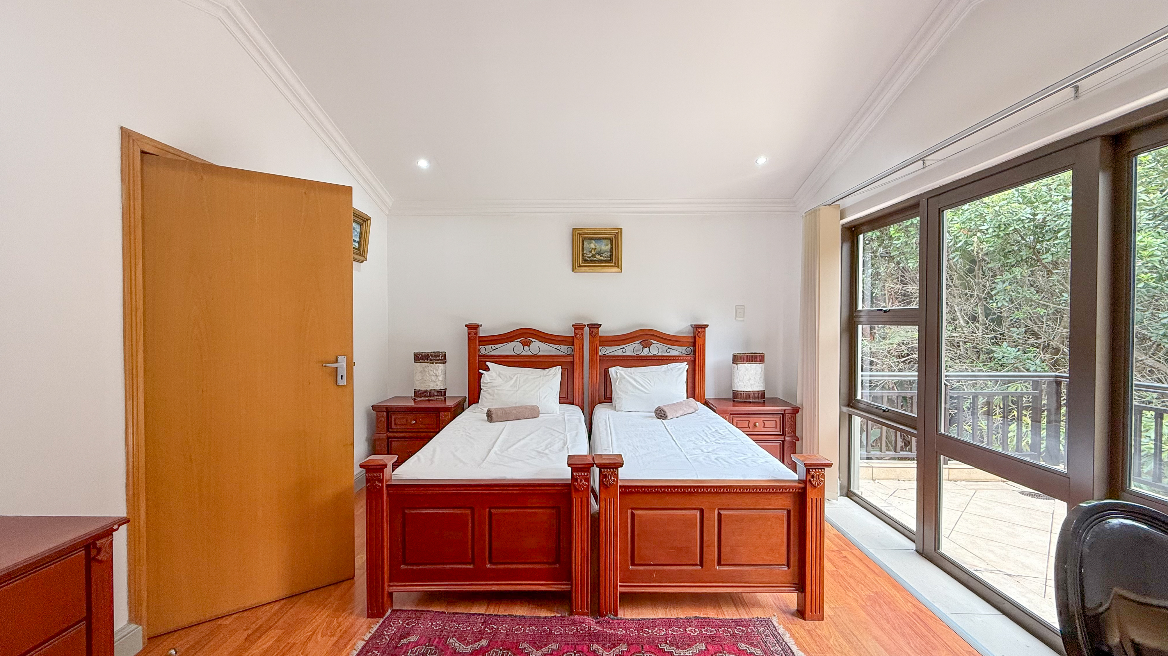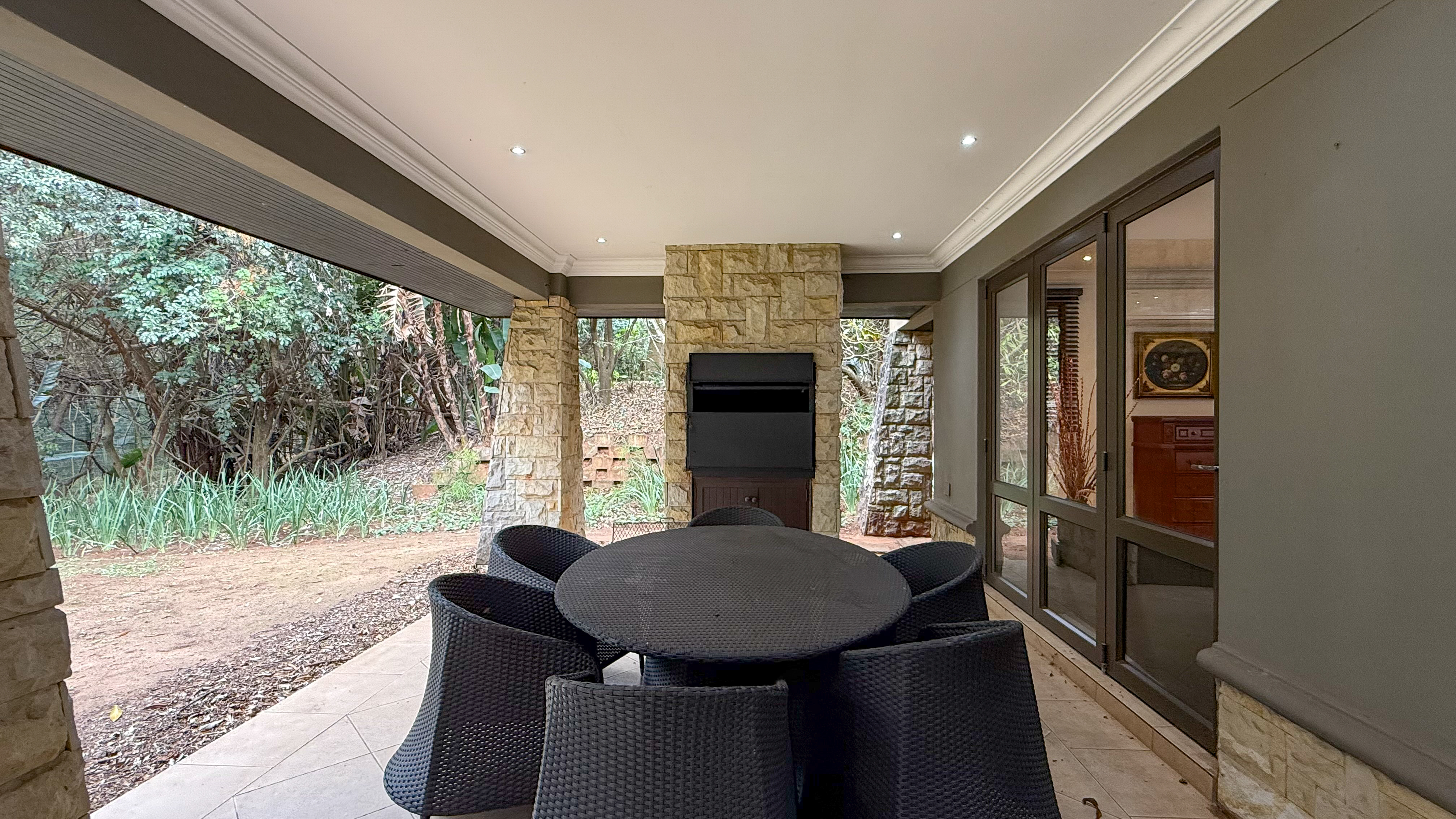 A double garage with direct access into the home enhances convenience, and the downstairs patio includes a built-in braai for easy outdoor living. The main bedroom also opens onto a private upstairs patio, adding an extra touch of luxury. Balinese-inspired design elements are evident in the rich timber finishes, soft neutral tones, and thoughtful integration with the lush natural surroundings.