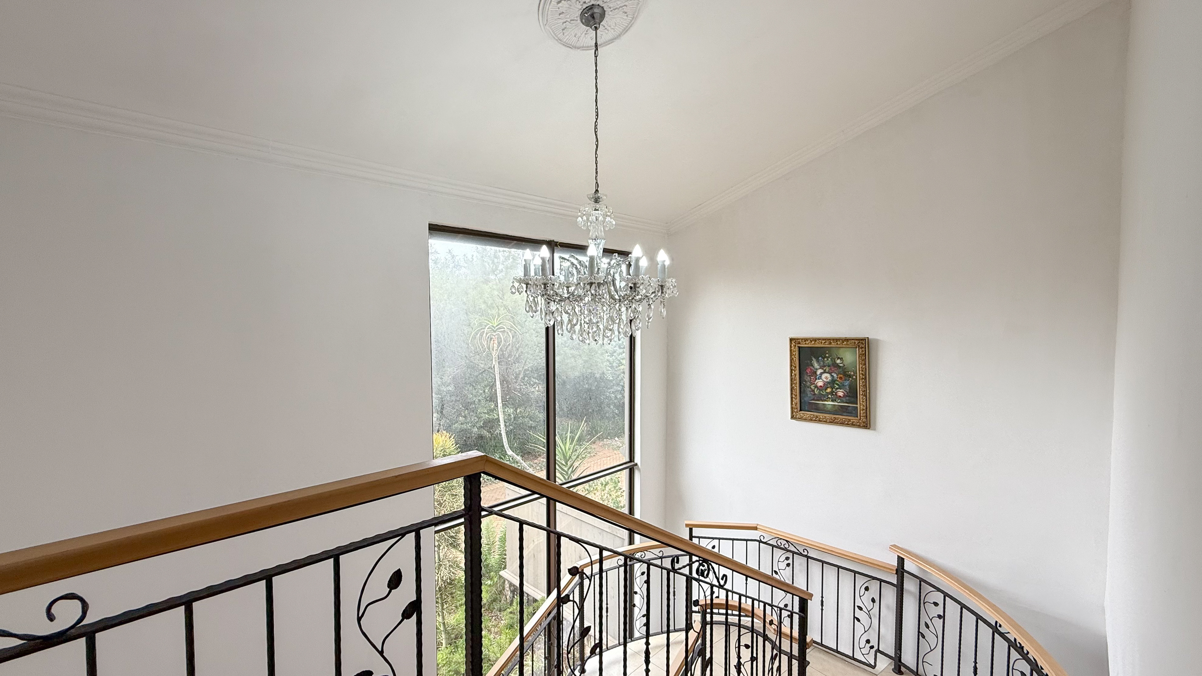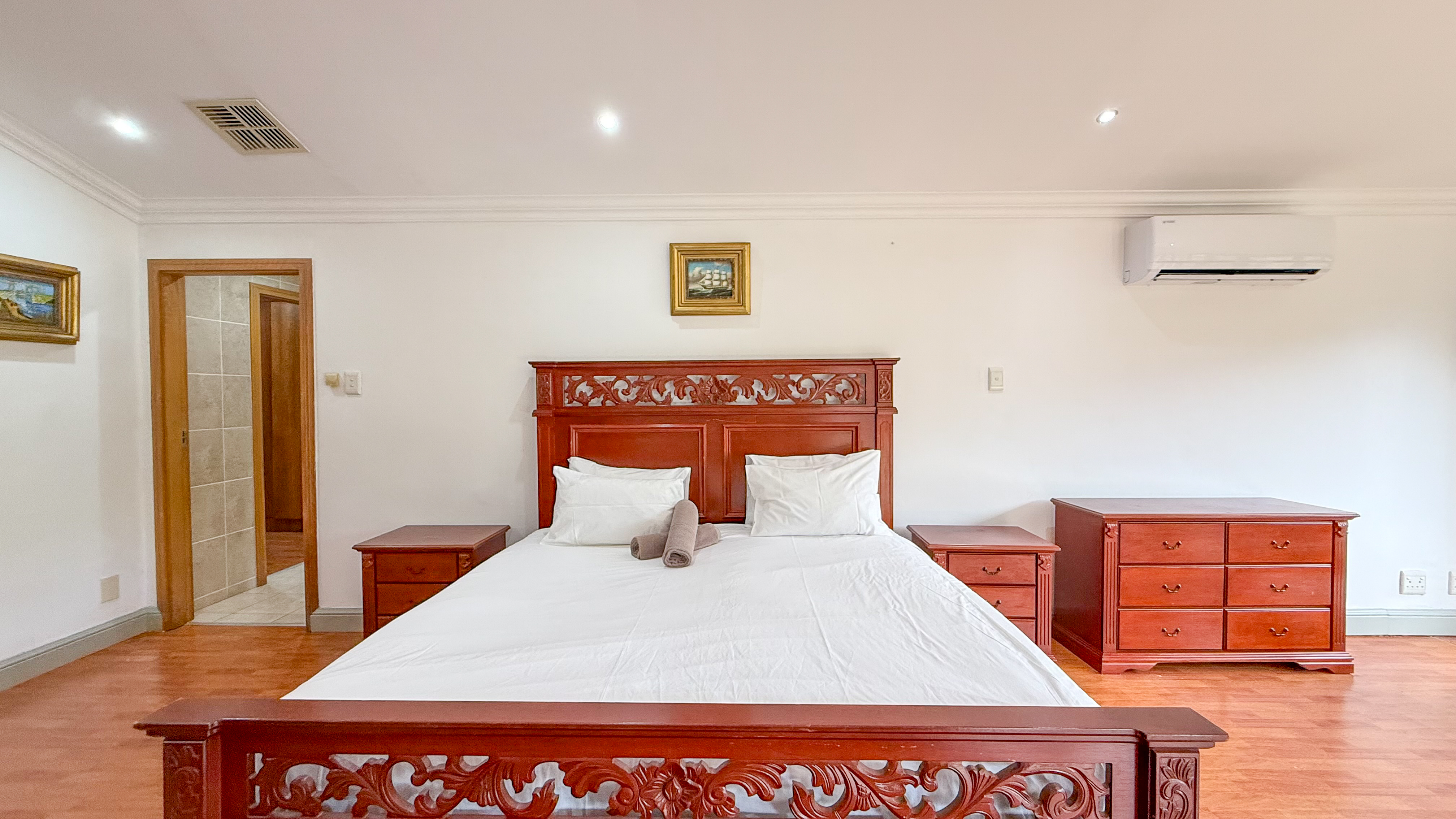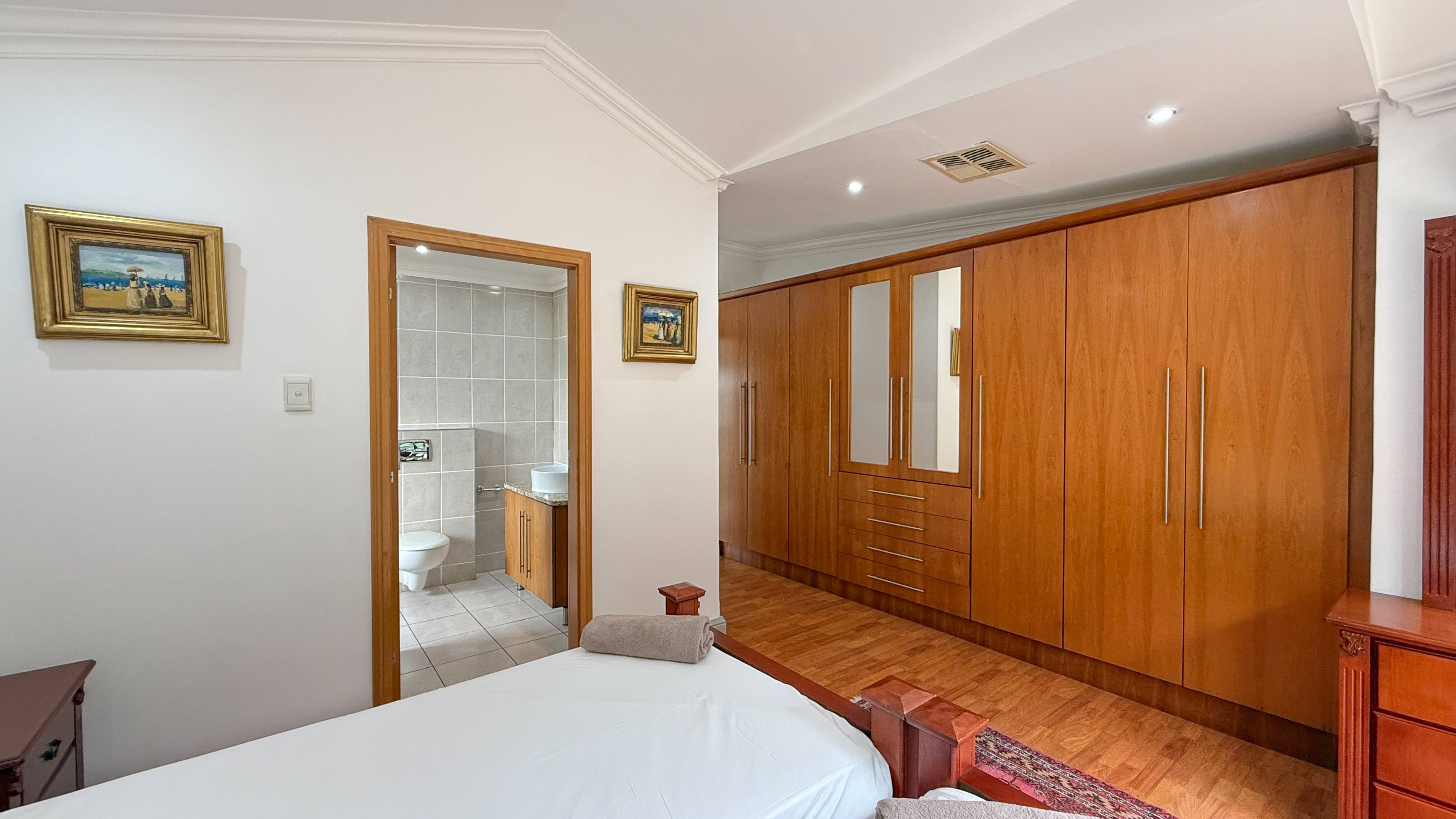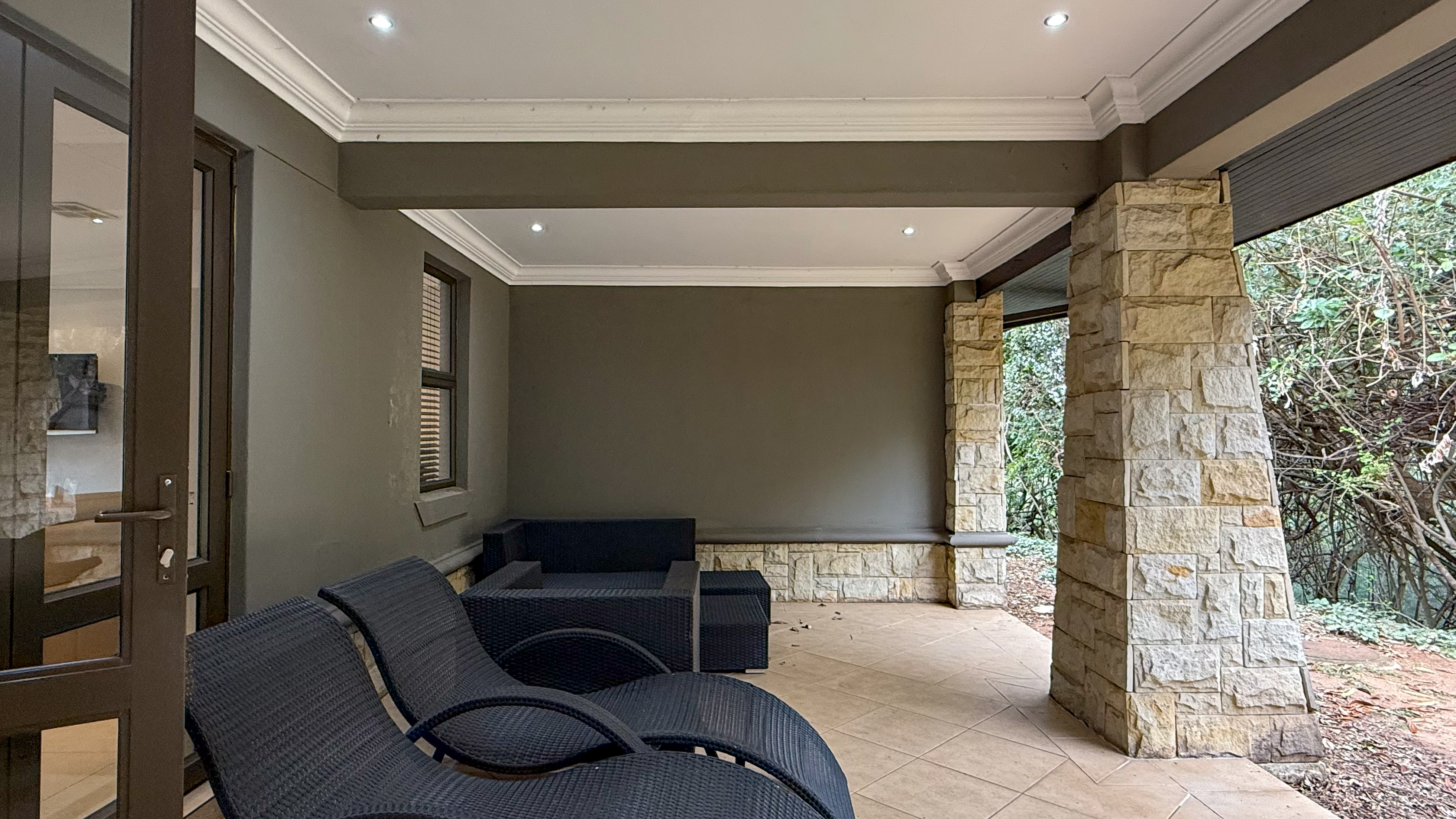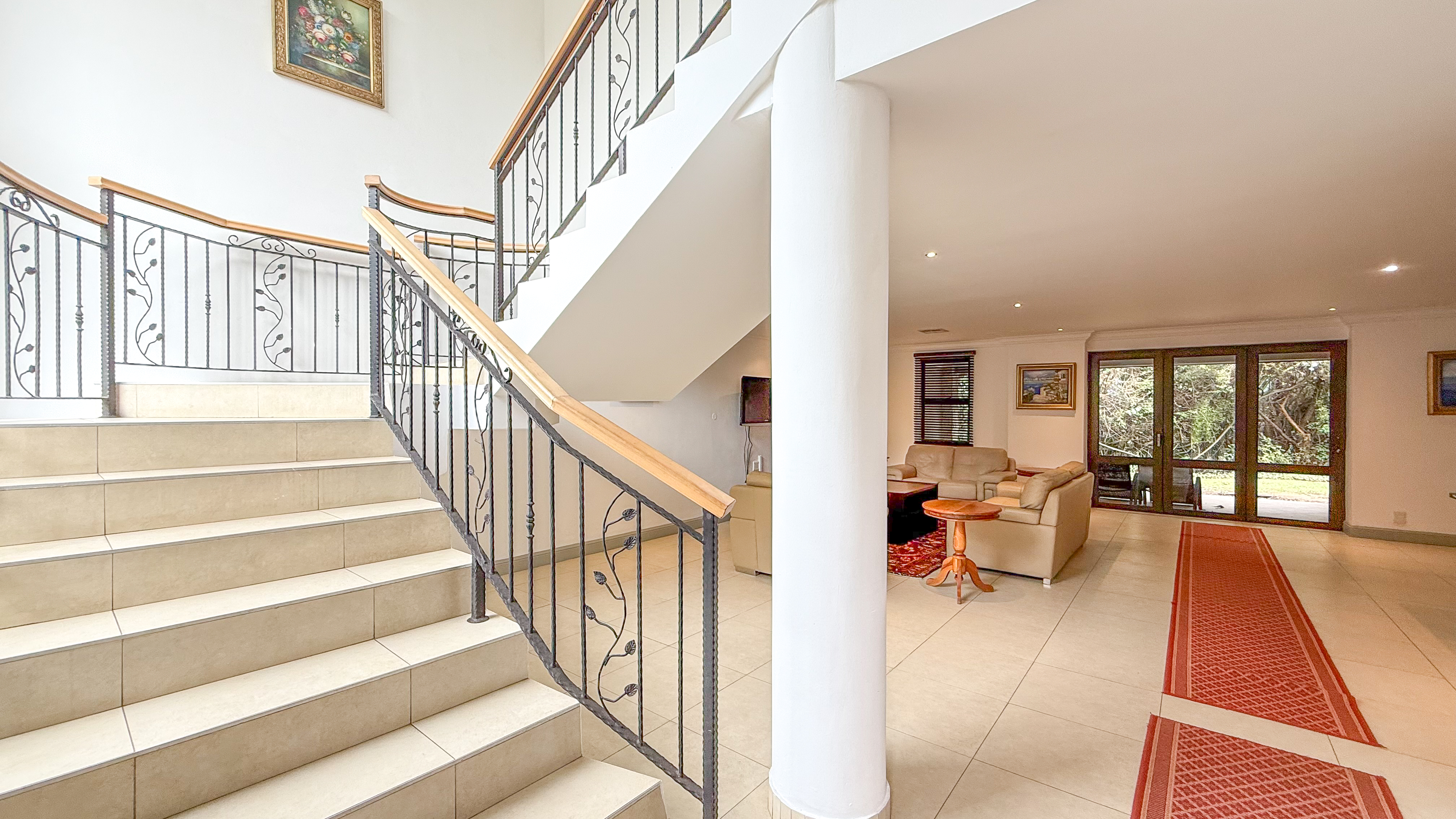A double garage with direct access into the home enhances convenience, and the downstairs patio includes a built-in braai for easy outdoor living. The main bedroom also opens onto a private upstairs patio, adding an extra touch of luxury. Balinese-inspired design elements are evident in the rich timber finishes, soft neutral tones, and thoughtful integration with the lush natural surroundings.