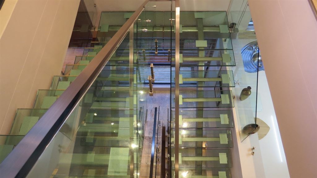 An exquisite chandelier over the stunning glass stairway, together with a scenic glass lift that traverses all three floors.