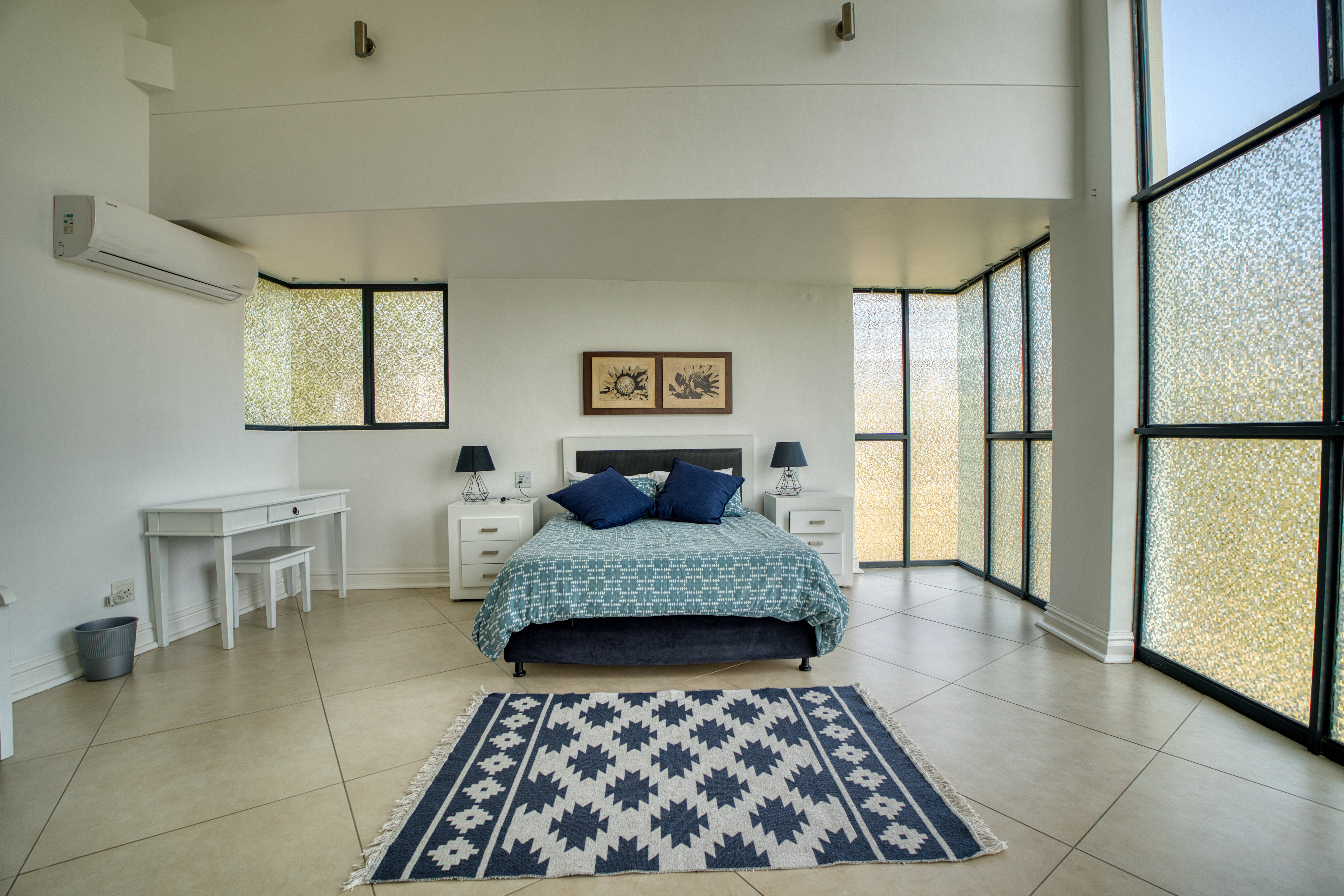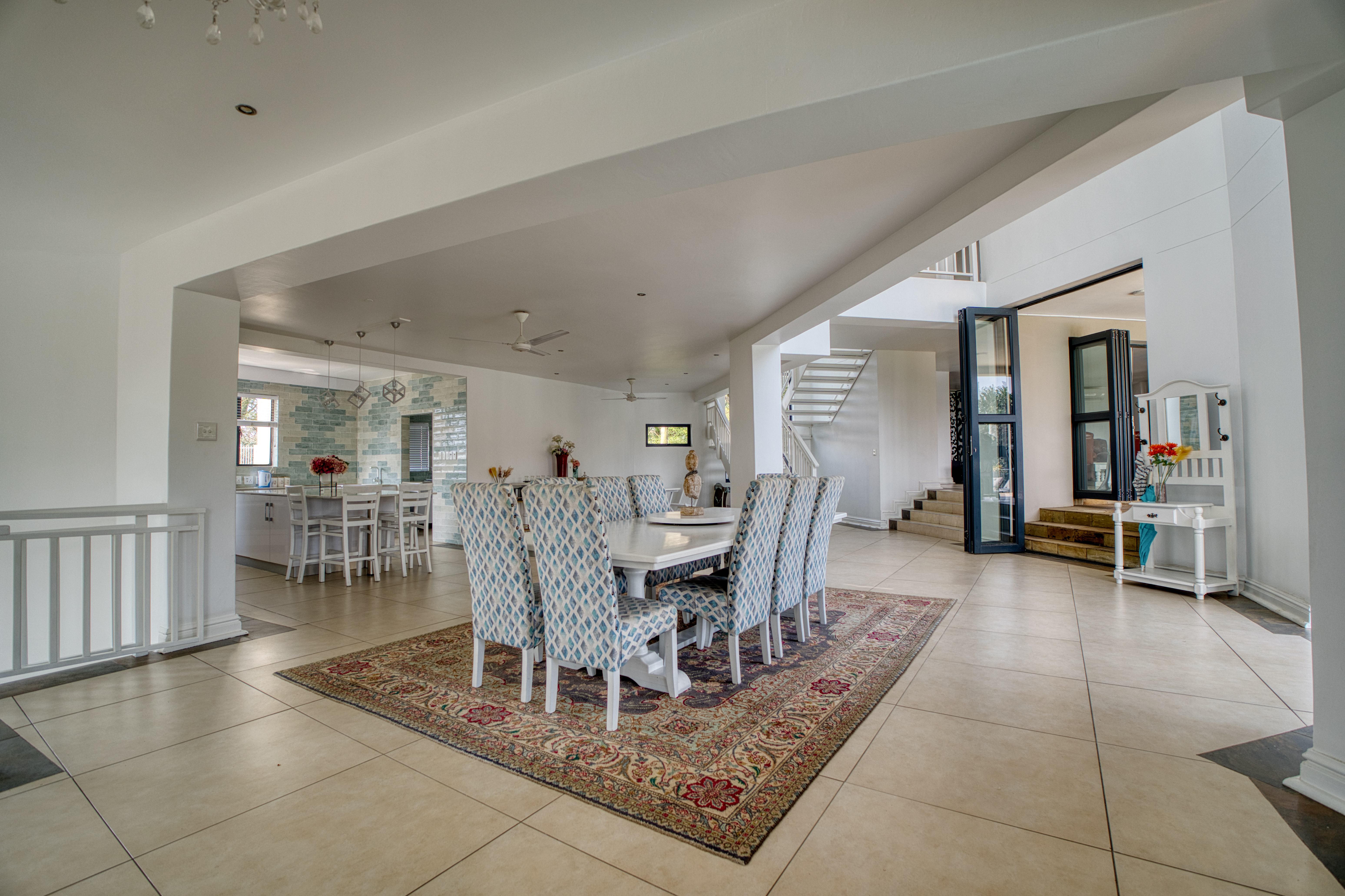 The open-plan ground floor includes a formal lounge, dining area, pool room, and a fully equipped kitchen with Smeg appliances, scullery, and guest loo. Two bedrooms are located downstairs, with five additional bedrooms upstairs—three of them en-suite. The master suite boasts a private veranda overlooking the ocean.