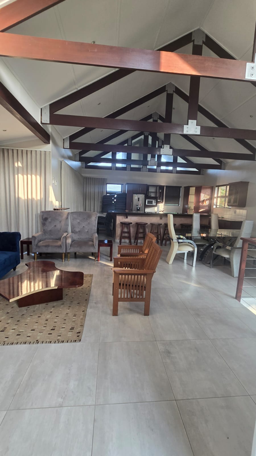 A striking wooden staircase, enhanced by expansive windows and an abundance of natural light, leads to the upper level. Here, high ceilings with exposed beams create an airy sense of space, while the open-plan formal lounge, dining area, and contemporary kitchen blend seamlessly. Stacking doors open onto a generous covered wrap-around balcony with a built-in braai—perfect for relaxed entertaining in a serene estate setting.
