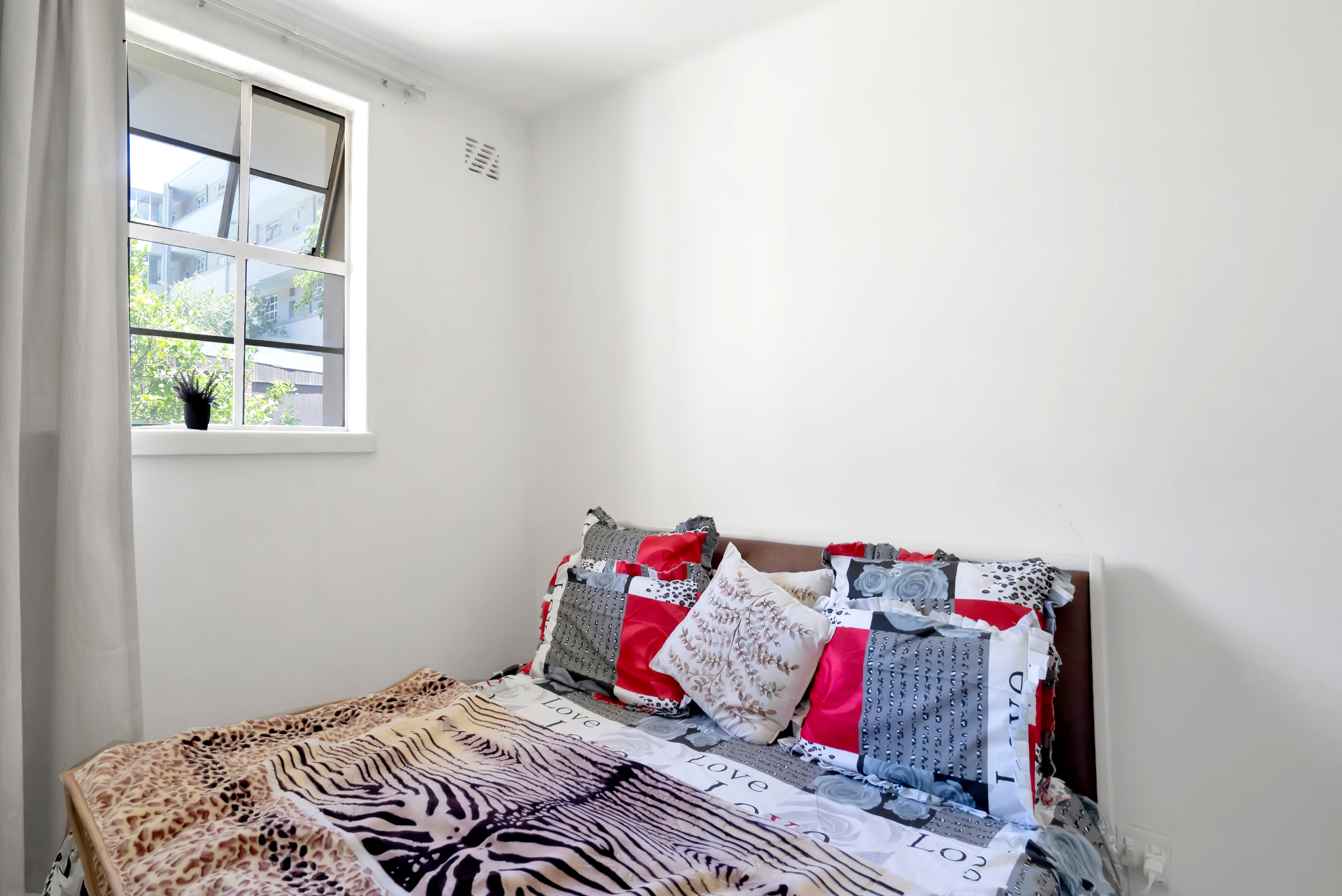 Open plan living and dining area filled with natural light, leading to a standard kitchen complete with a breakfast bar—ideal for casual dining or morning coffee. The spacious bedroom features built-in cupboards and comfortably fits a double bed, desk, and TV console. The full bathroom is designed with added convenience, housing both a washer and dryer.