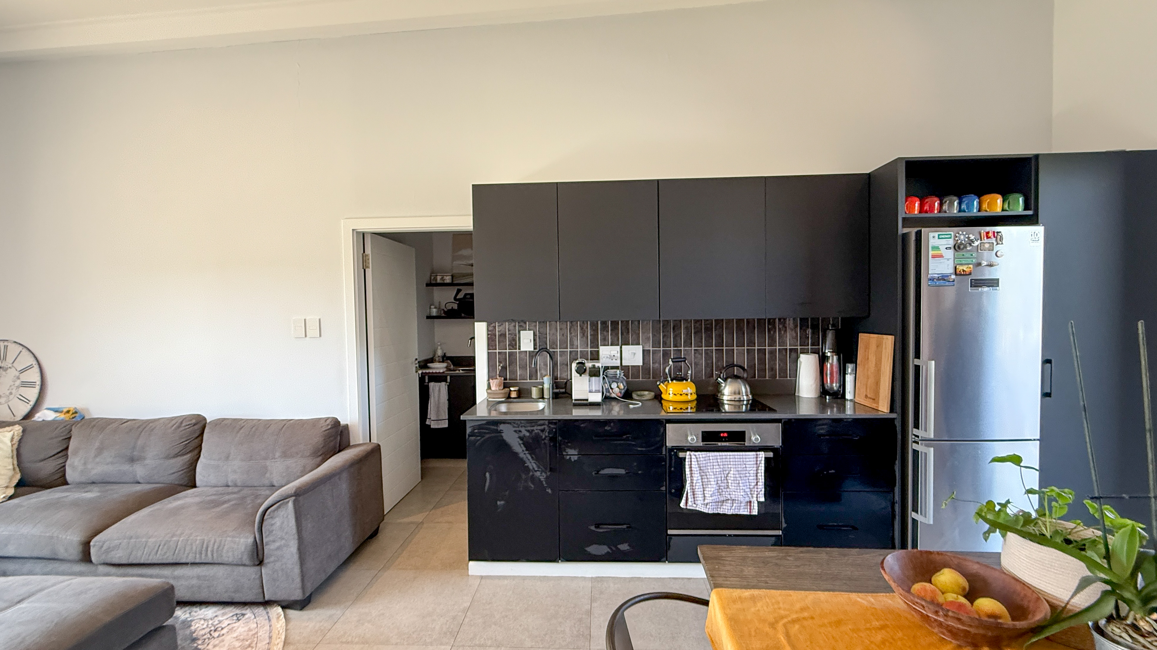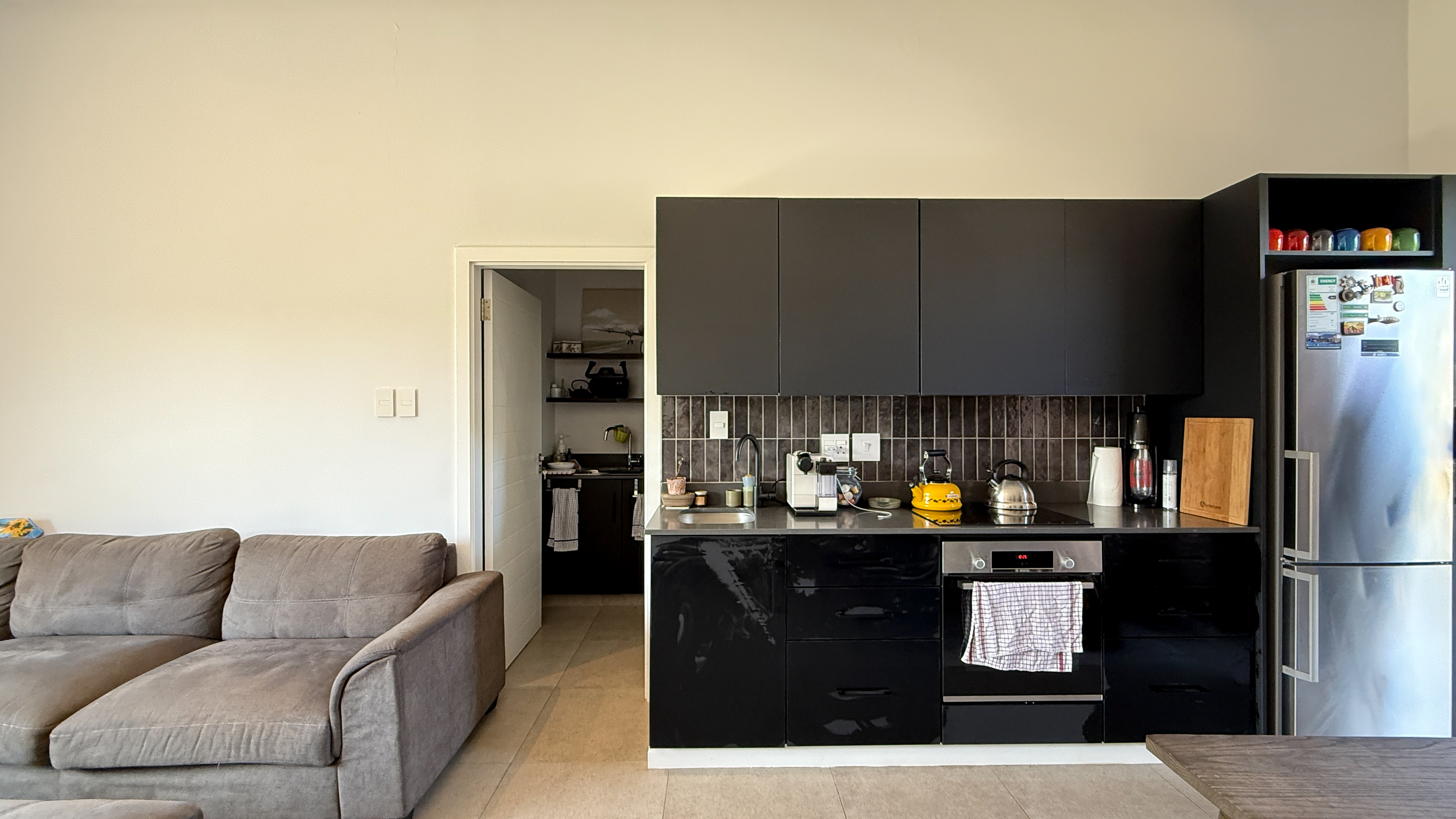 The contemporary kitchen is fitted with high-end integrated appliances and features a concealed scullery and laundry area, combining sleek design with practical functionality.