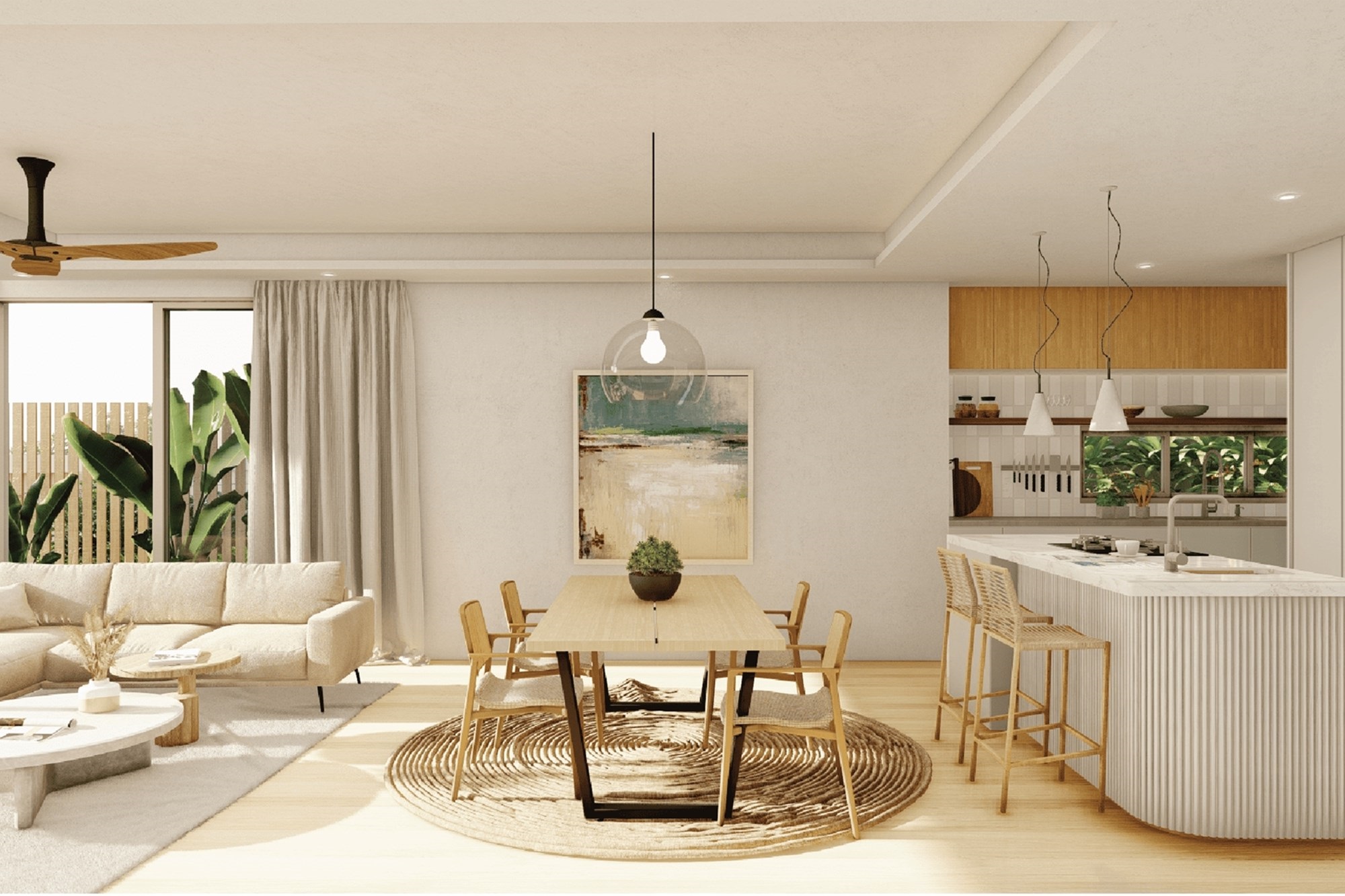 Each 3-bedroom unit features a sleek, contemporary design with high-quality finishes. Think open-plan living spaces, floor-to-ceiling glass doors, and a calm natural colour palette of whites, beiges, and wood tones – all designed to bring in light and capture the beauty of the coast.