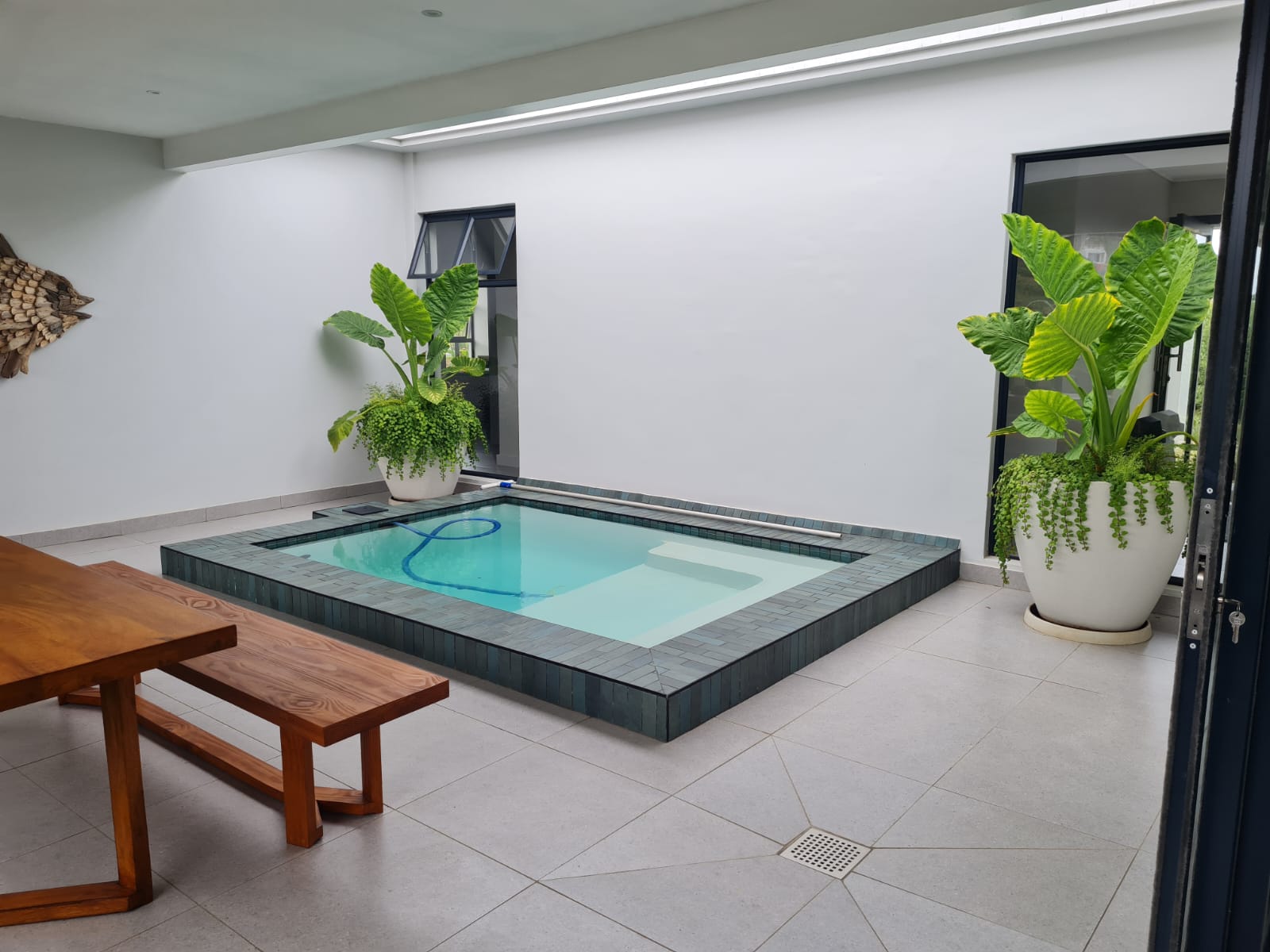 Indoor and outdoor living come together seamlessly on the covered patio, where an indoor swimming pool and built-in braai area create a year-round entertainment space overlooking Zululami’s lush greenbelt. This inviting area flows out to a private garden, offering a safe and serene space for children to play.