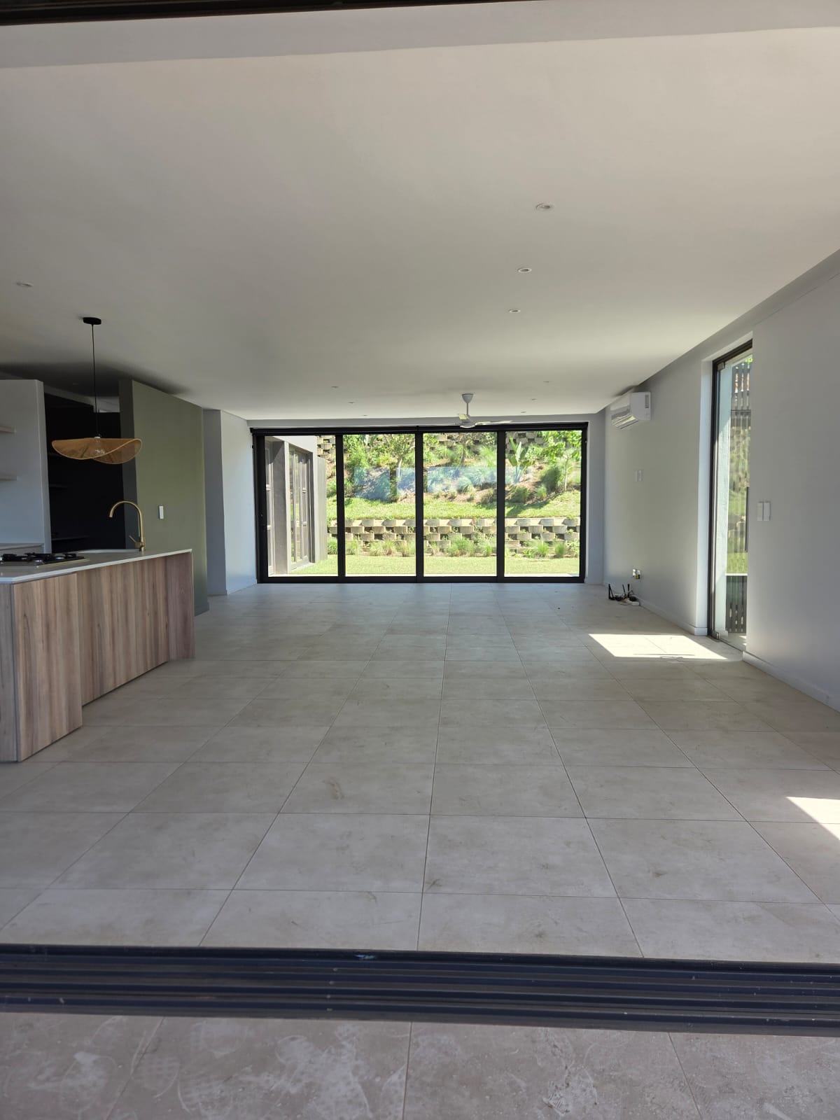 The open-plan kitchen flows seamlessly into the dining and living spaces, boasting large sliding doors that open onto a covered patio – perfect for enjoying sundowners with family and friends. Step outside into your private garden, ideal for braais, relaxation, and making memories.
