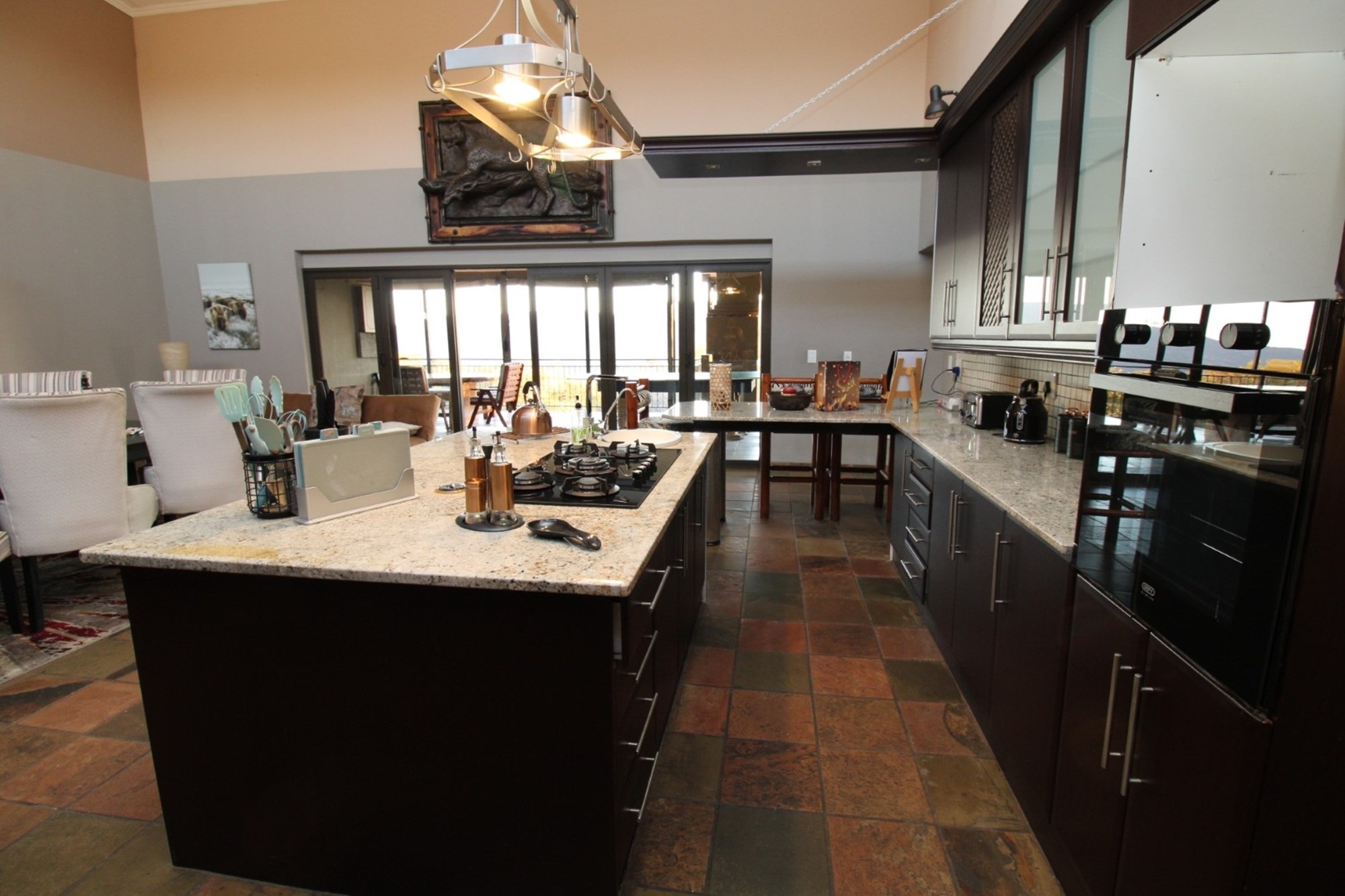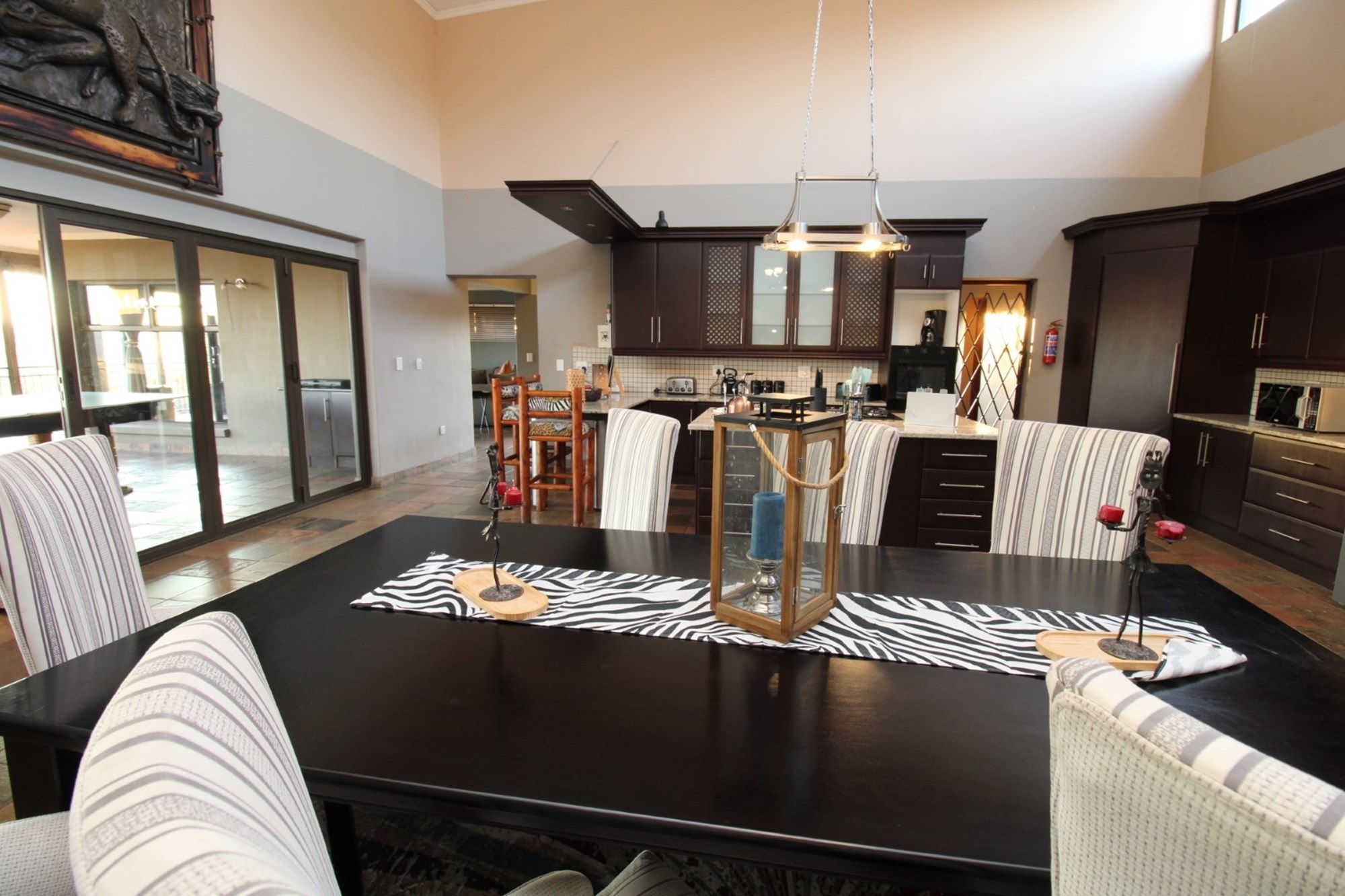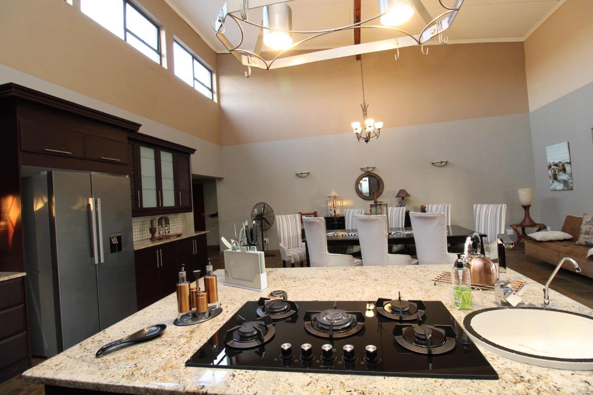 This thoughtfully designed home centers around a modern kitchen featuring gleaming granite countertops, a sleek gas stove set into a spacious island, and ample room for a double-door fridge. A cozy breakfast nook sits beside a dedicated coffee station, all flowing effortlessly toward sliding doors that open onto a sunlit patio—perfect for morning rituals or evening meals. The open-plan dining area adjoins the kitchen, showcasing a striking high ceiling with exposed wood beams and generous space for an eight-seater table. Tucked away is a practical laundry and scullery zone, equipped with a double basin, space for three appliances, and five built-in cupboards for seamless storage. Outdoors, the courtyard completes the picture with an industrial-style steel cage housing gas units, an external sink for messy tasks, and a washing line tucked neatly for everyday convenience.