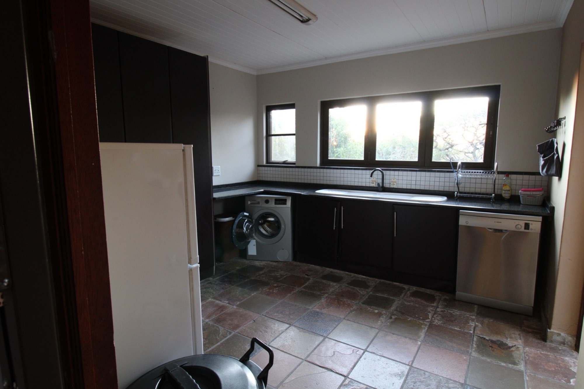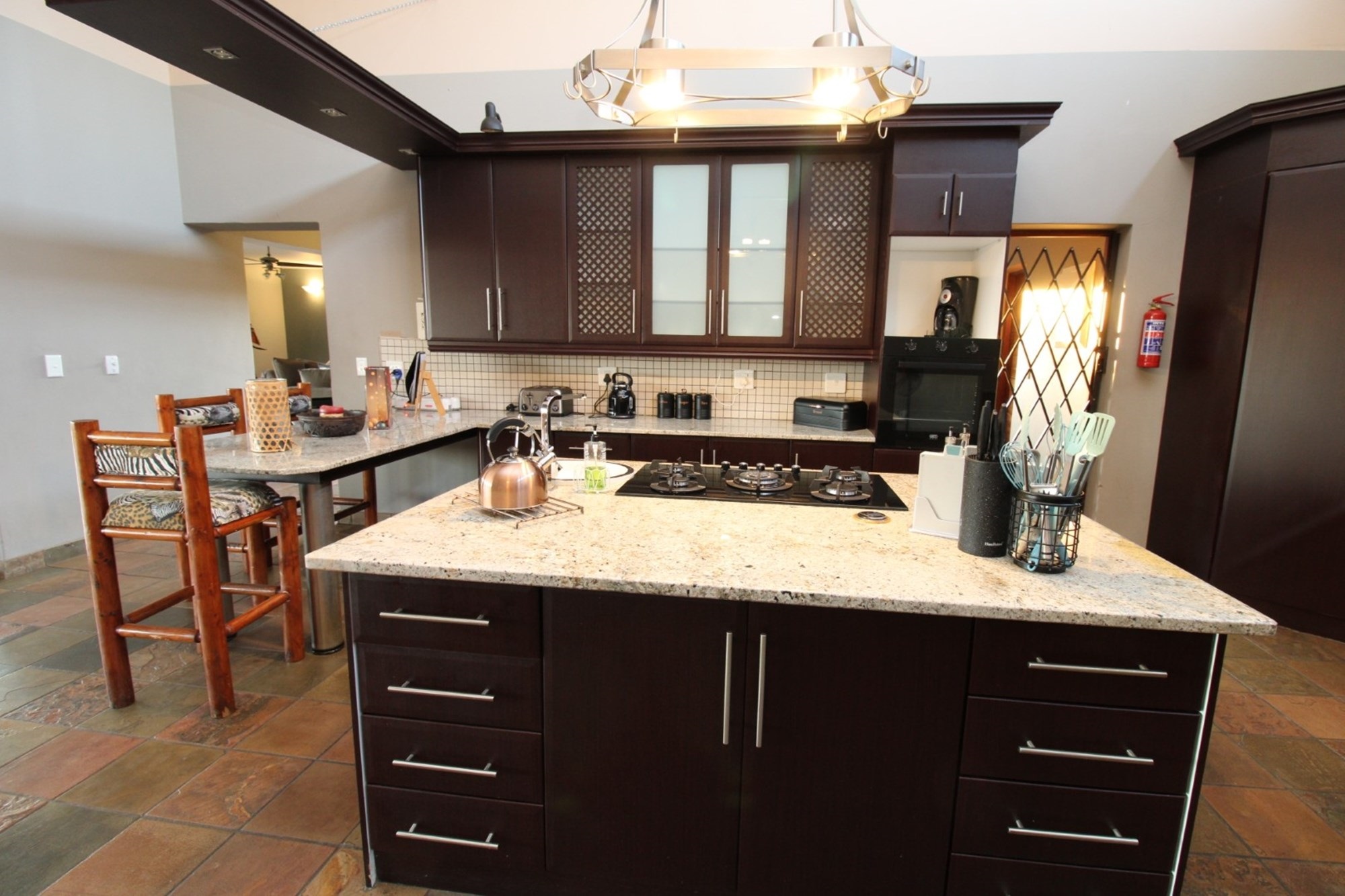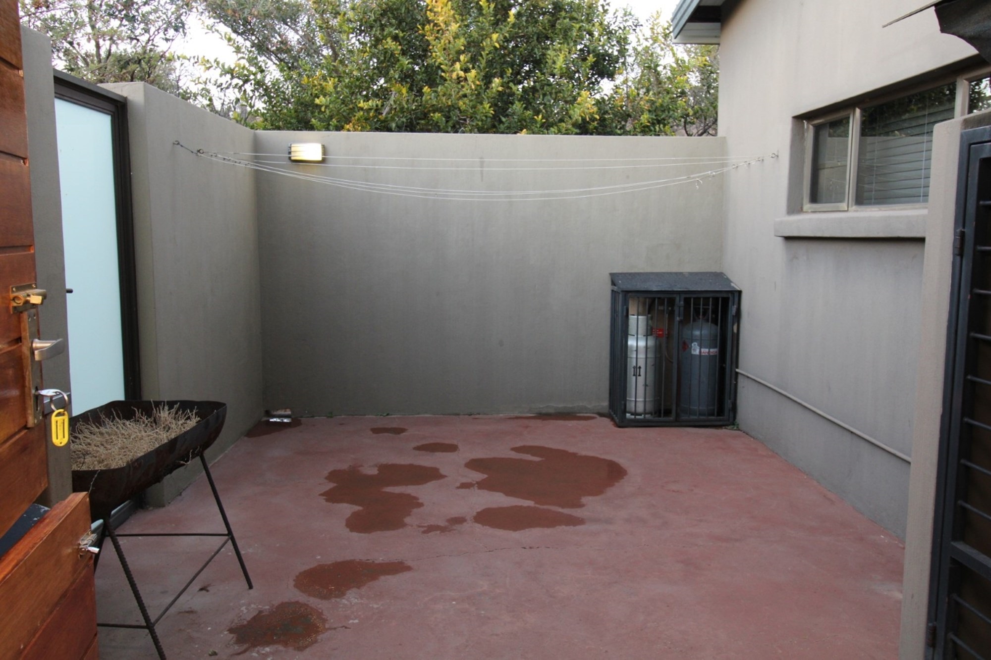 This thoughtfully designed home centers around a modern kitchen featuring gleaming granite countertops, a sleek gas stove set into a spacious island, and ample room for a double-door fridge. A cozy breakfast nook sits beside a dedicated coffee station, all flowing effortlessly toward sliding doors that open onto a sunlit patio—perfect for morning rituals or evening meals. The open-plan dining area adjoins the kitchen, showcasing a striking high ceiling with exposed wood beams and generous space for an eight-seater table. Tucked away is a practical laundry and scullery zone, equipped with a double basin, space for three appliances, and five built-in cupboards for seamless storage. Outdoors, the courtyard completes the picture with an industrial-style steel cage housing gas units, an external sink for messy tasks, and a washing line tucked neatly for everyday convenience.