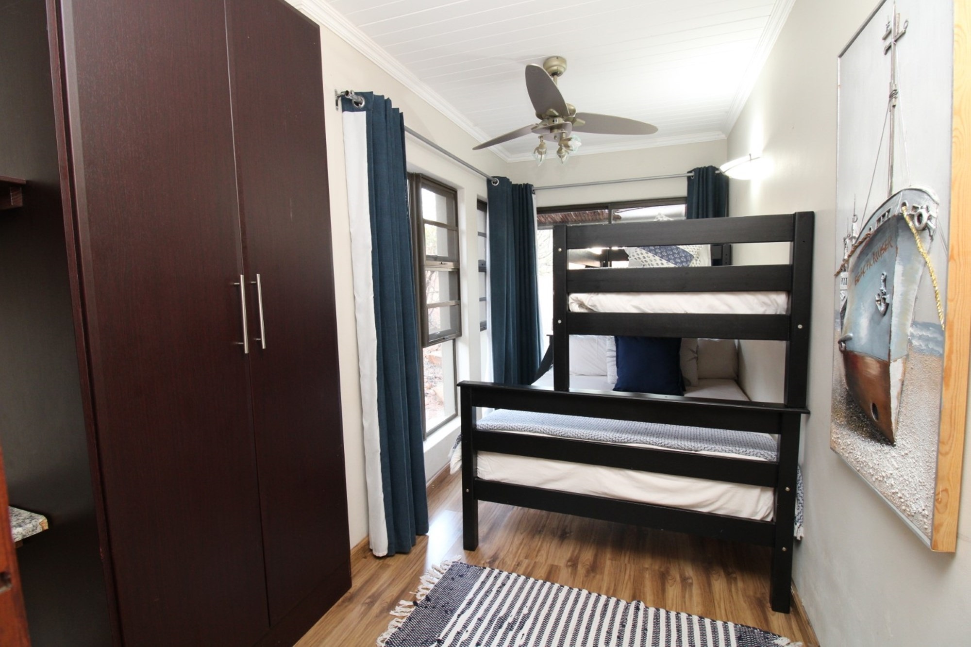 Small bunk bedroom with BIC, desk and bookshelves.