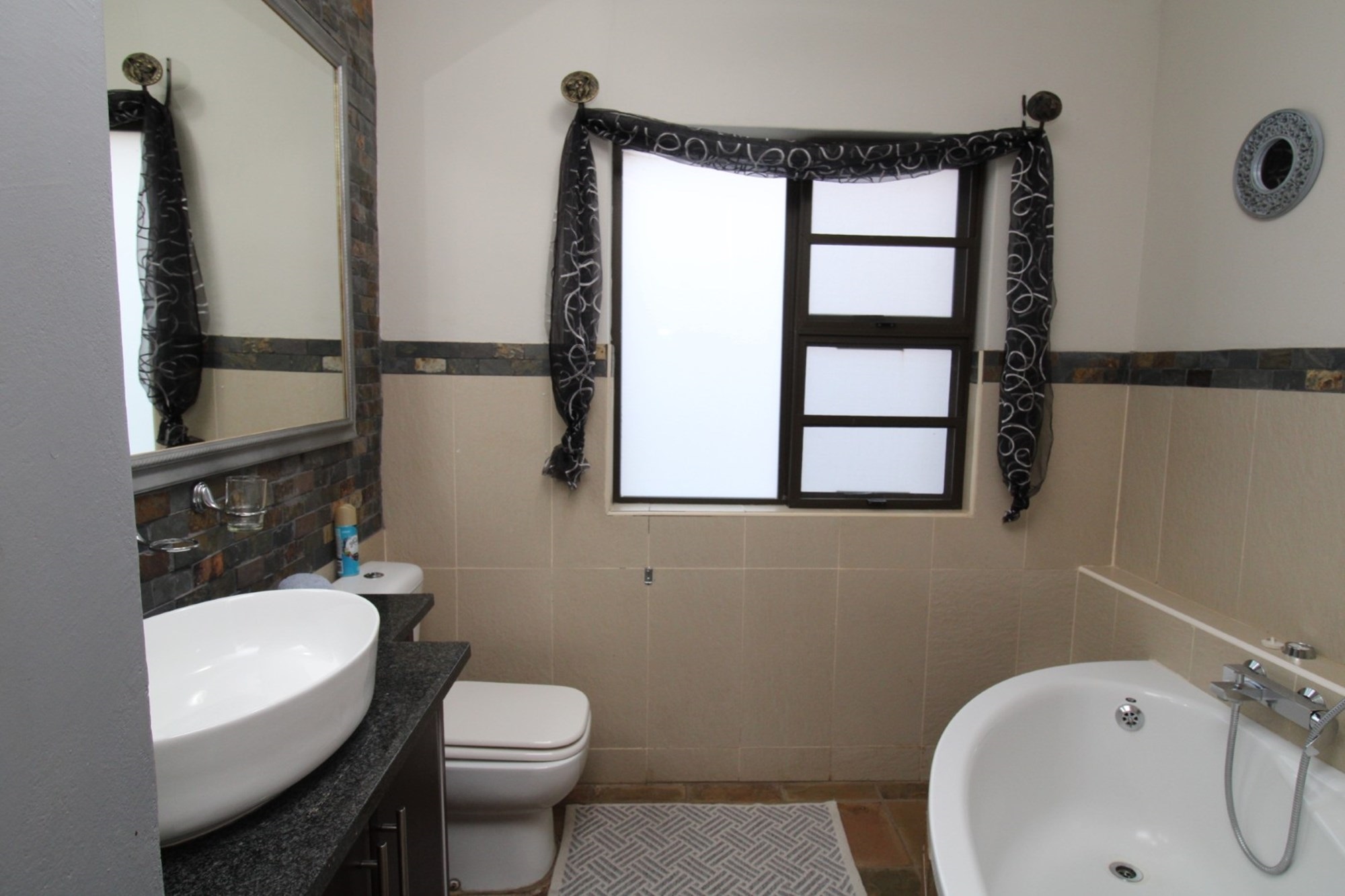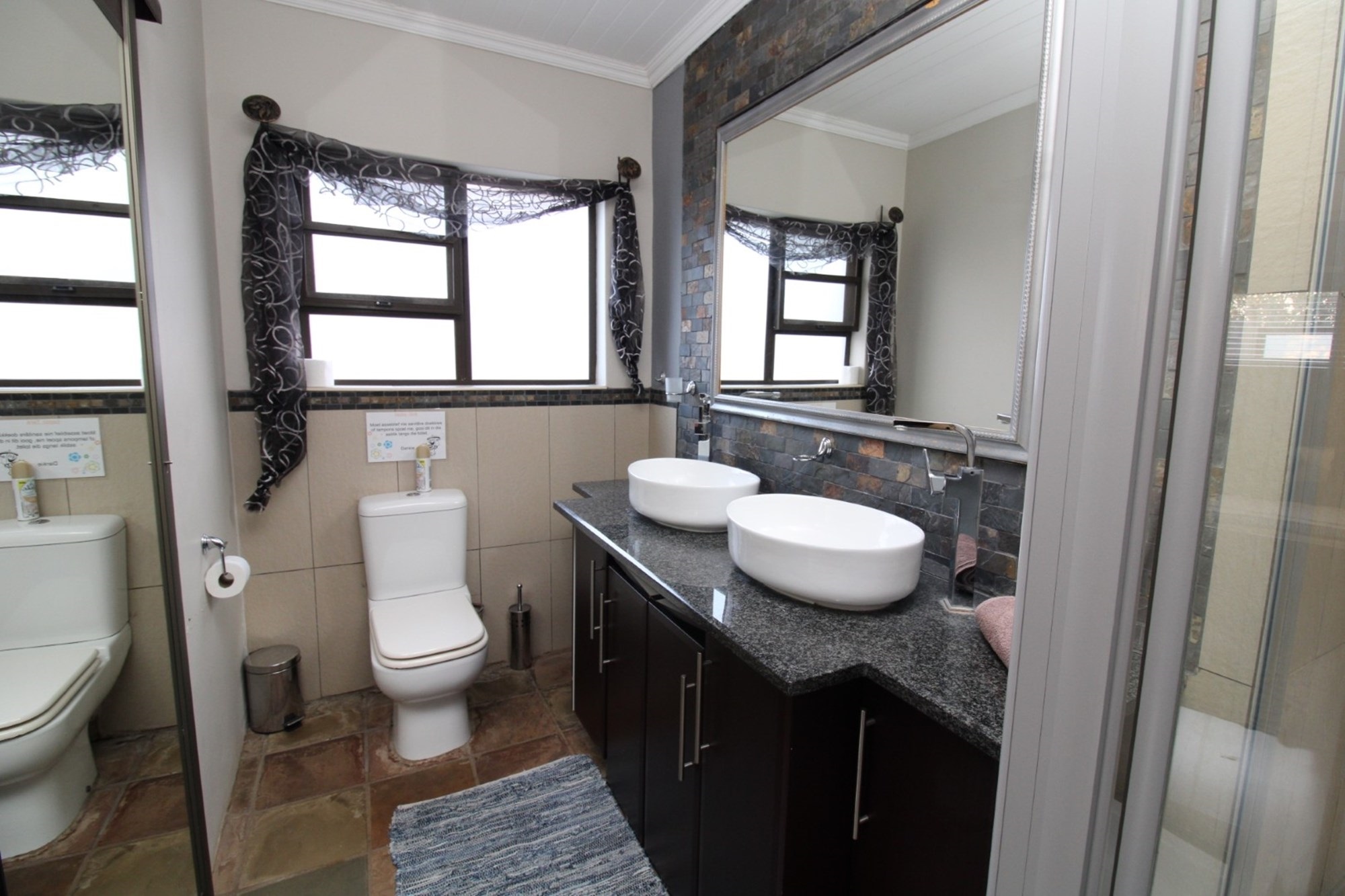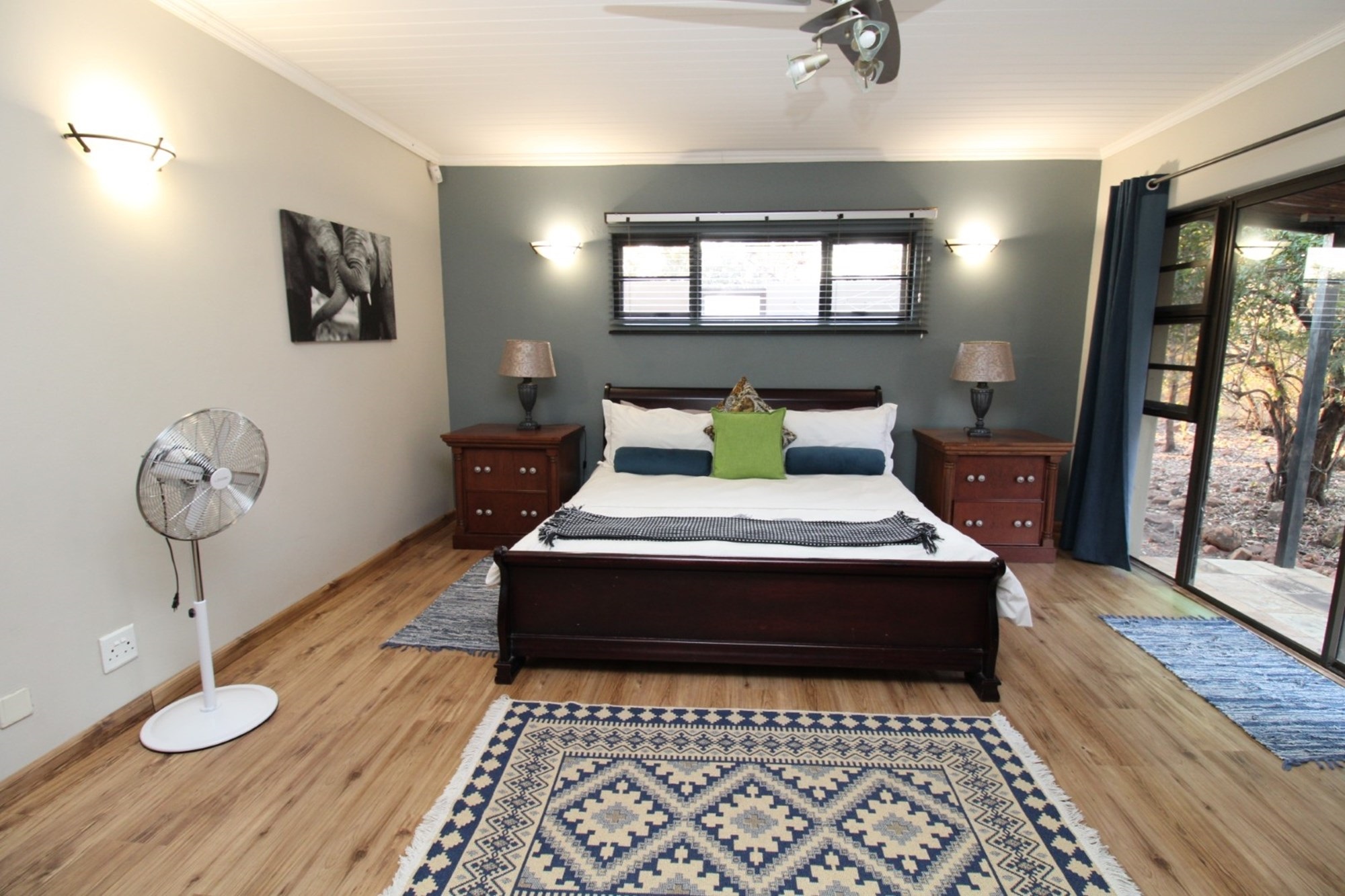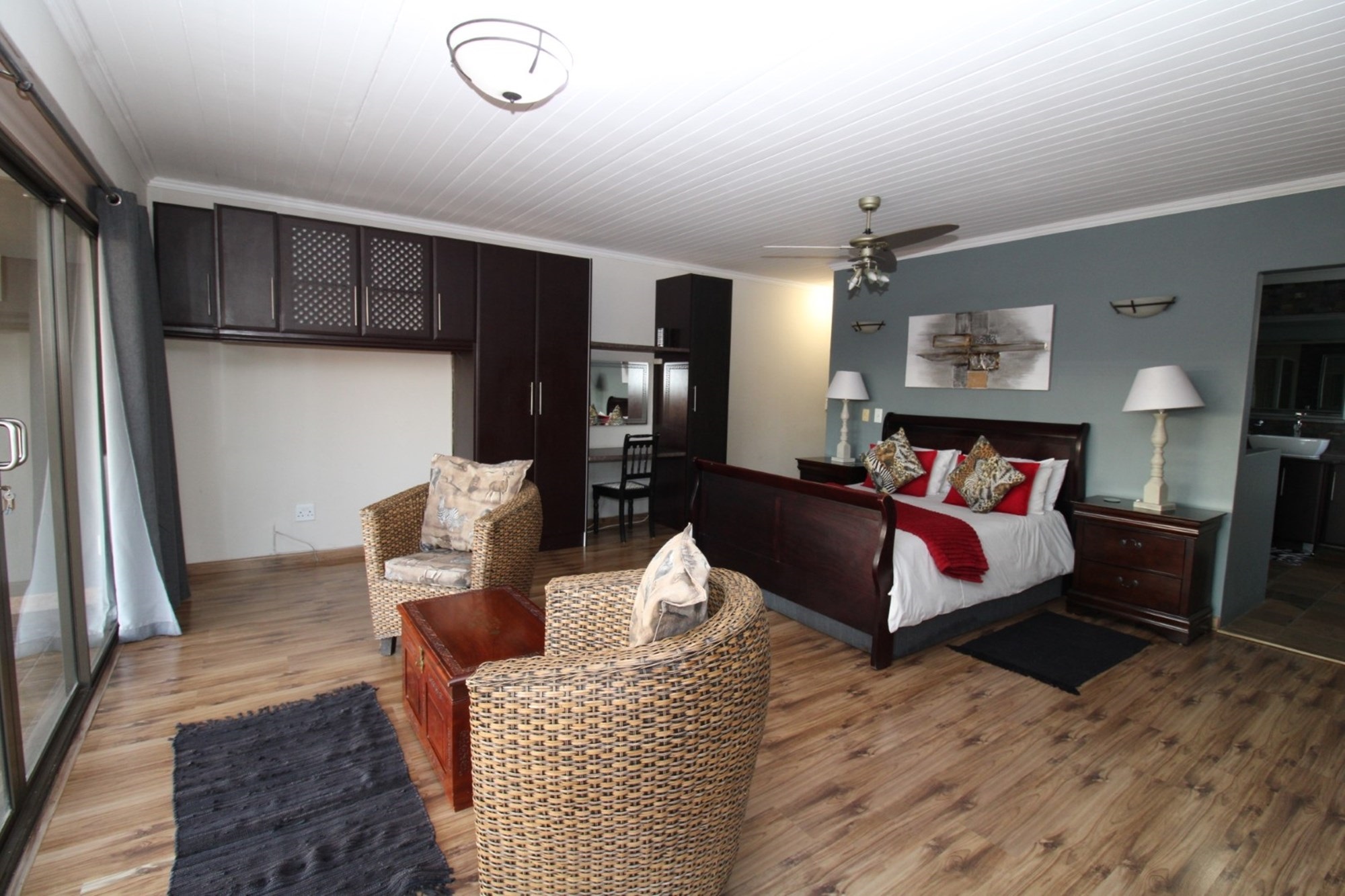 Escape to tranquility in this exquisite bedroom, boasting a spacious layout and direct access to a patio balcony with breathtaking panoramic views. Dark wood furnishings including ample built in cupboards and space for dressing table and a cozy seating area. The room is completed laminated flooring and a ceiling fan, ensuring a comfortable and serene retreat. The en-suite bathroom offers a sleek corner bath with soft skylight illumination, inviting indulgent soaks. Adjacent stands a glass-enclosed walk-in shower, with a convenient built in shower seat. Facing the bath, a vanity stretches gracefully with two sculptural basins.