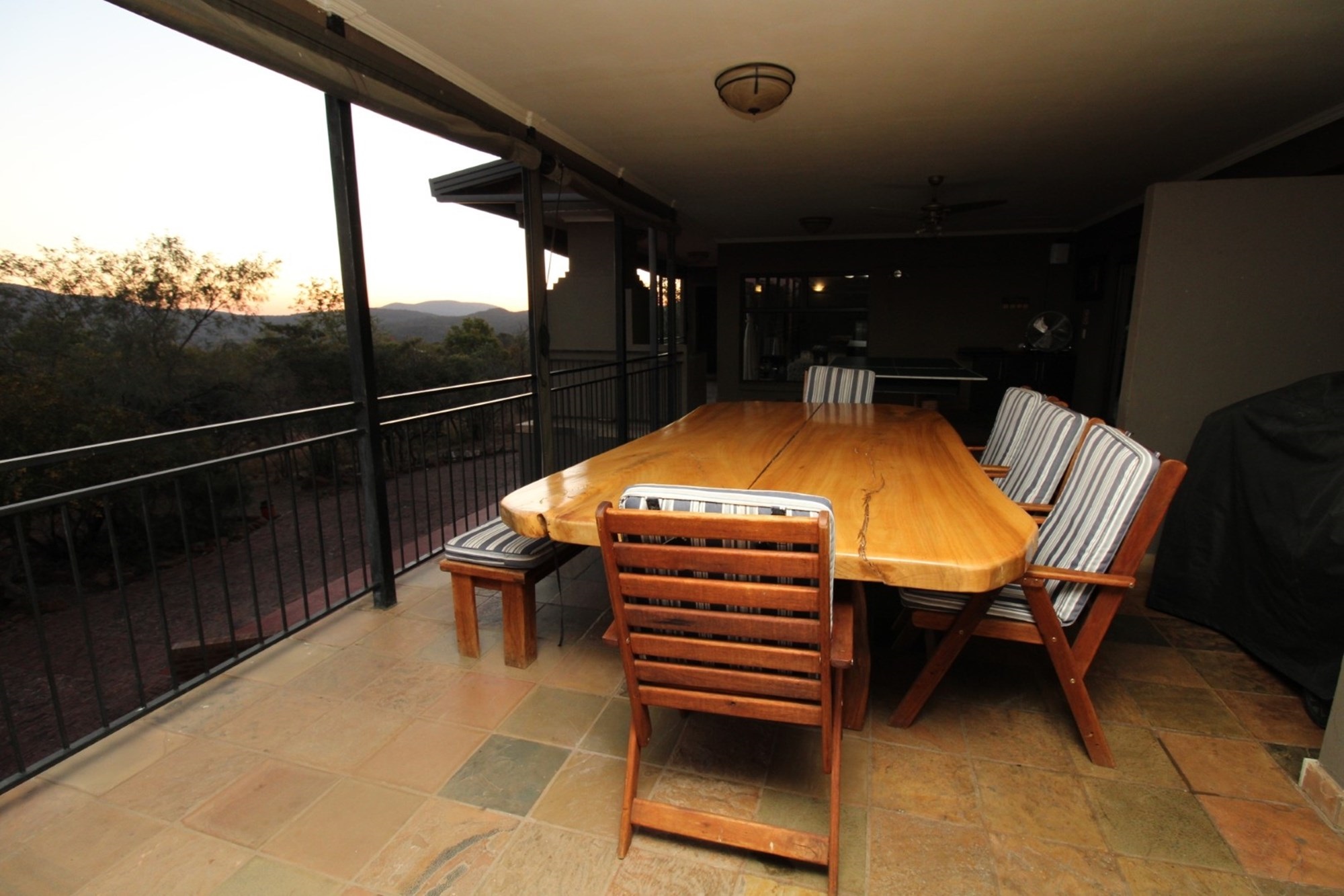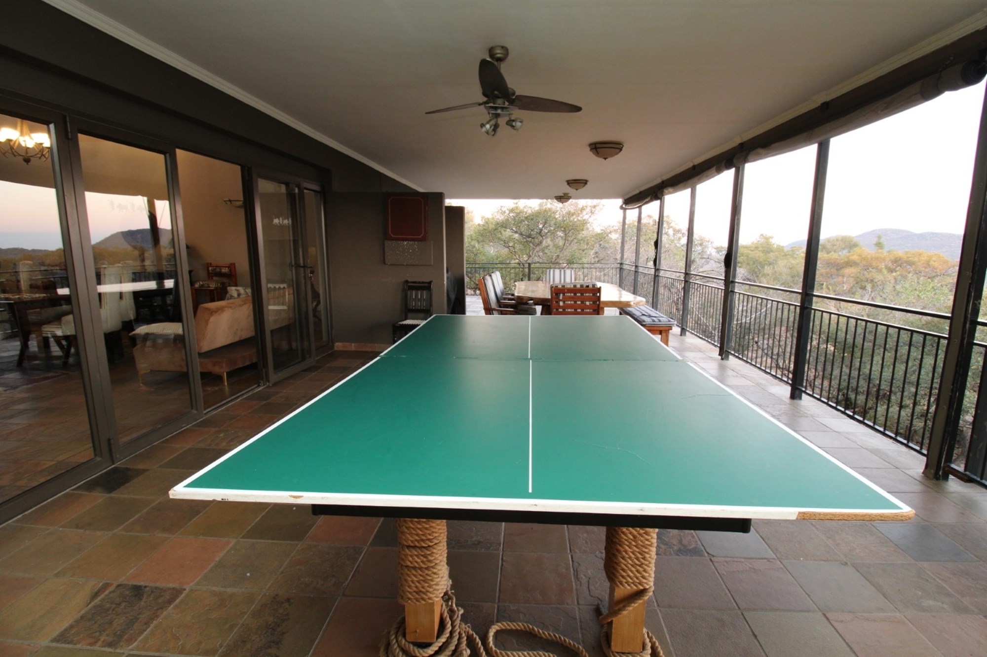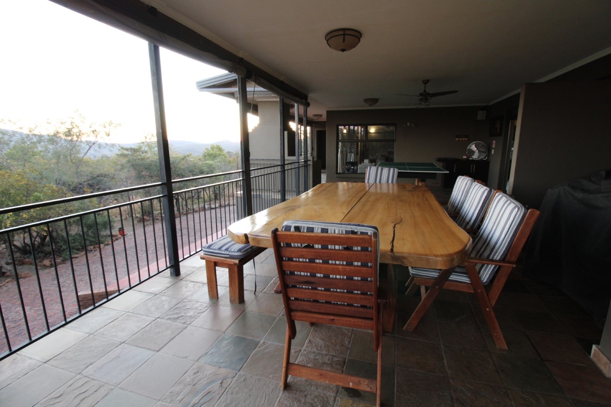 Discover an expansive outdoor living space designed for relaxation and entertainment. This stunning patio features a dedicated table tennis area for lively games, alongside a spacious dining setting perfect for al fresco meals with a view. There is also a built-in braai as well as a guest toilet. There is roll-down canvas should the winter air be a bit chilly. Enjoy the tranquility of the surrounding landscape from this elevated retreat, complete with a ceiling fan for comfort and ample space for unwinding. The vibrant hues of the setting sun cast a warm glow over the expansive landscape, featuring rolling hills and lush, natural bushveld. From a vantage point offering panoramic views of the Waterberg mountains, witness nature`s spectacle unfolds, promising unforgettable moments of tranquility and beauty.