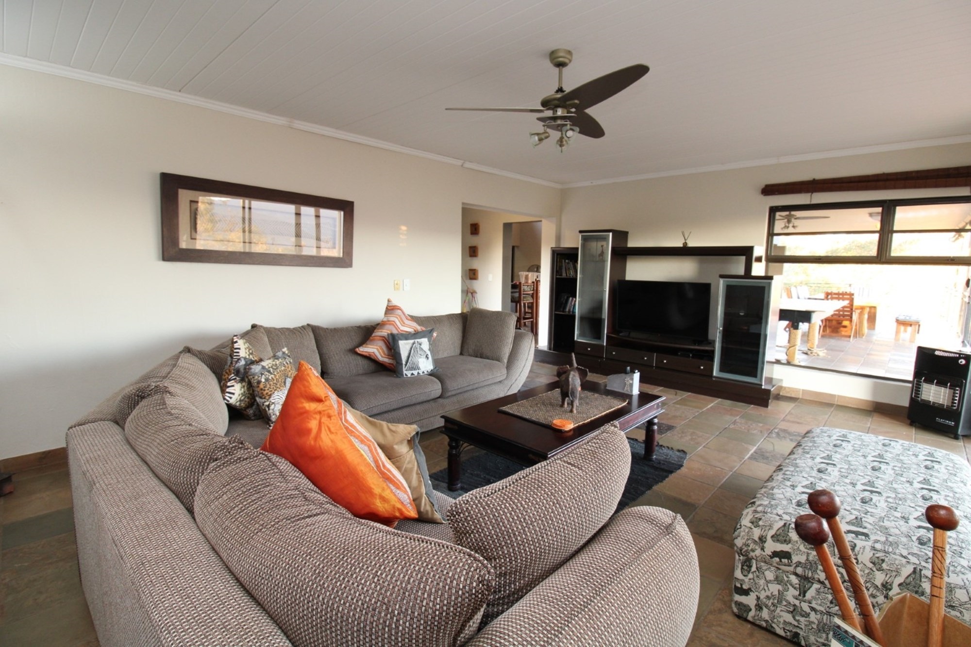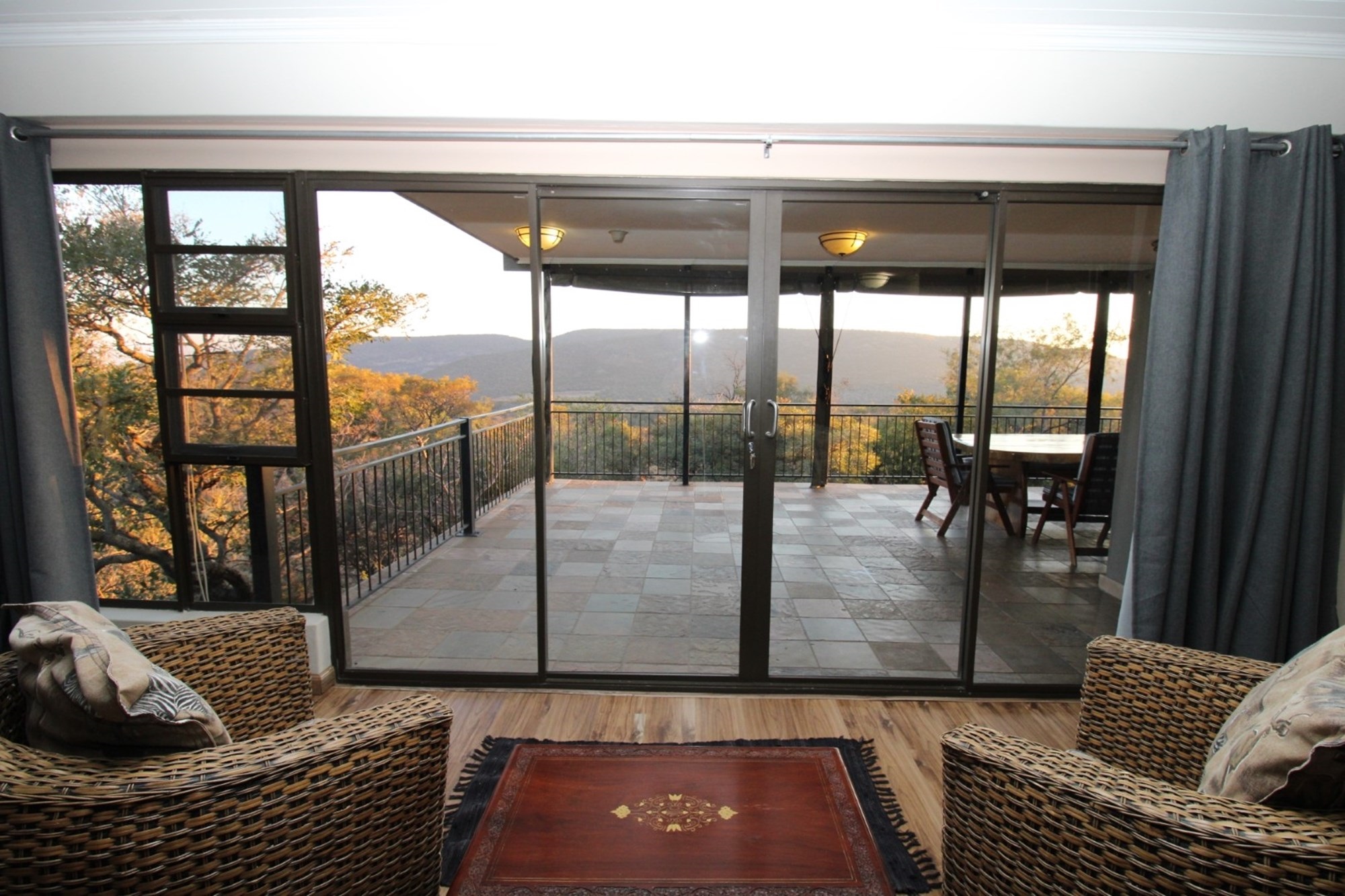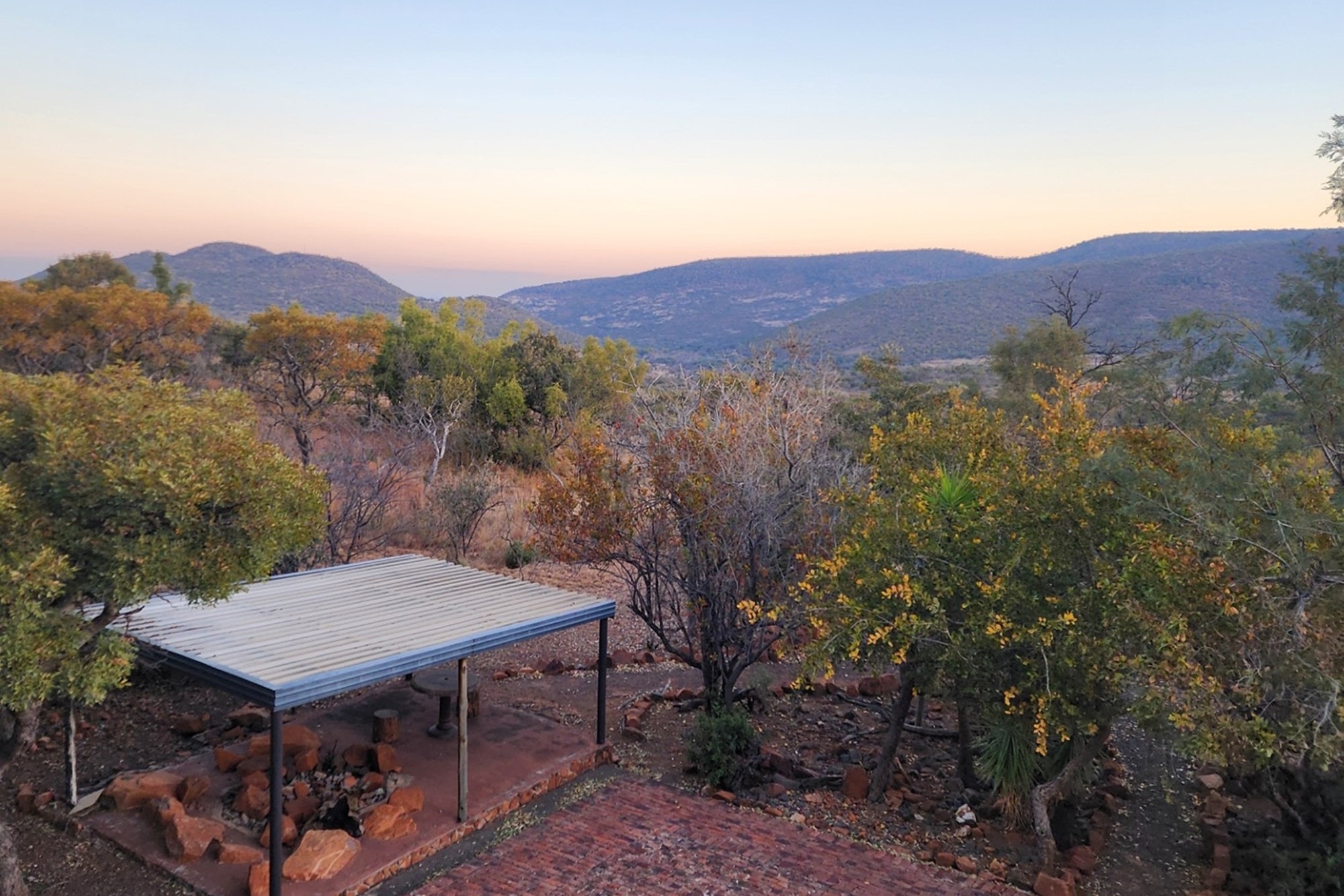 Discover an expansive outdoor living space designed for relaxation and entertainment. This stunning patio features a dedicated table tennis area for lively games, alongside a spacious dining setting perfect for al fresco meals with a view. There is also a built-in braai as well as a guest toilet. There is roll-down canvas should the winter air be a bit chilly. Enjoy the tranquility of the surrounding landscape from this elevated retreat, complete with a ceiling fan for comfort and ample space for unwinding. The vibrant hues of the setting sun cast a warm glow over the expansive landscape, featuring rolling hills and lush, natural bushveld. From a vantage point offering panoramic views of the Waterberg mountains, witness nature`s spectacle unfolds, promising unforgettable moments of tranquility and beauty.