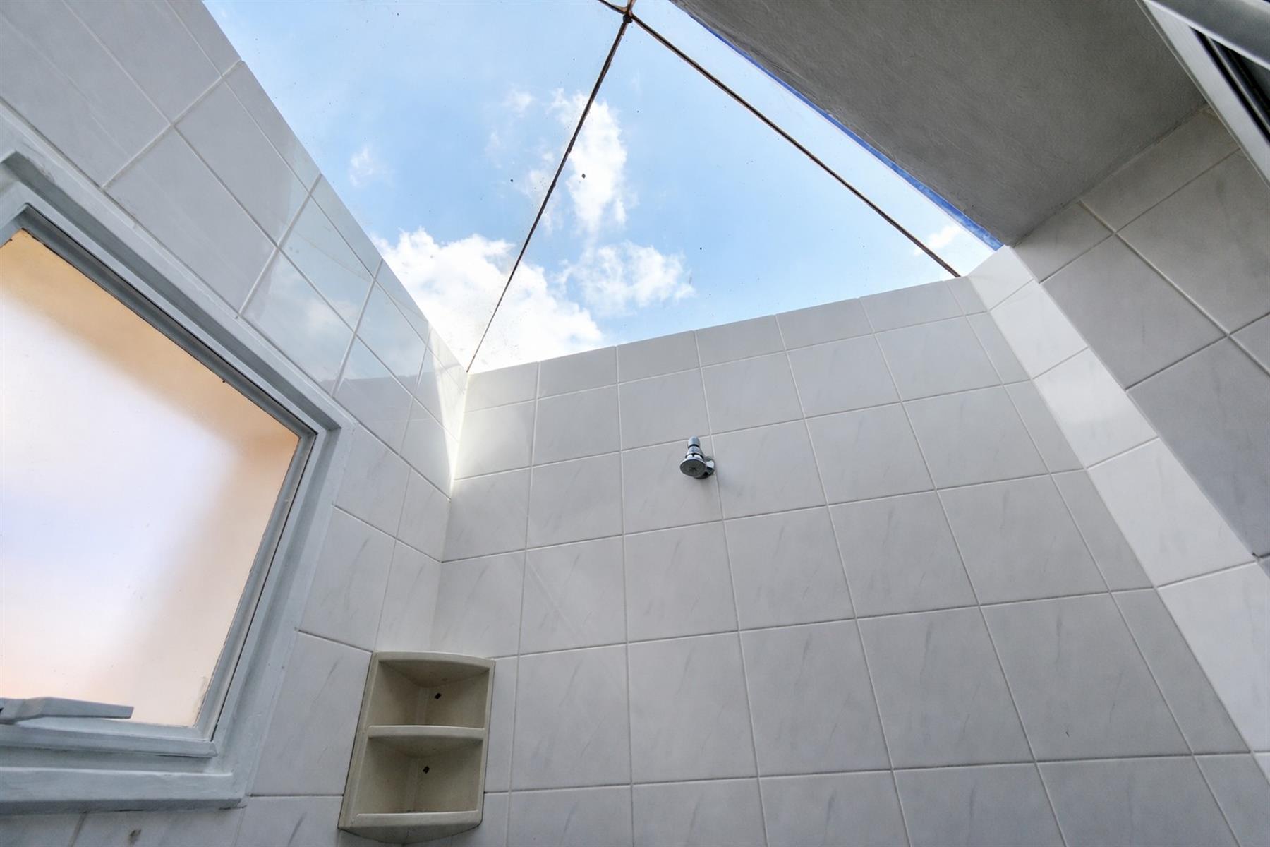 The bathroom features a skylight shower, allowing for plenty of natural light and showering under the stars.