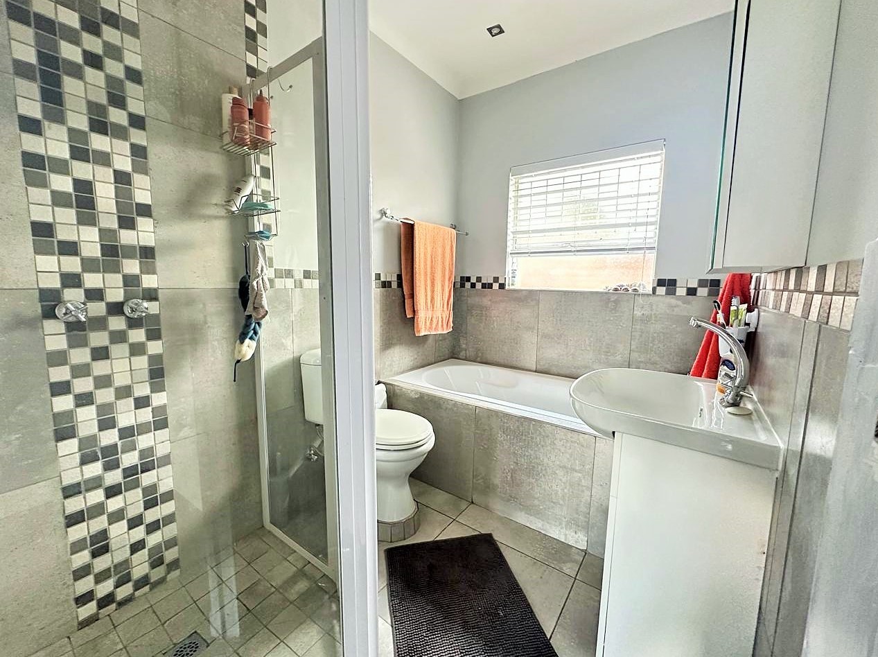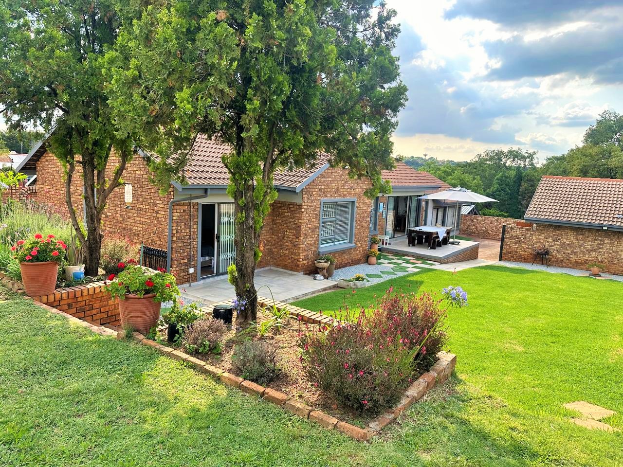 Main bedroom - featuring an en-suite bathroom with a bath, shower, basin, and toilet, sliding door leading outside to a beautiful landscaped garden