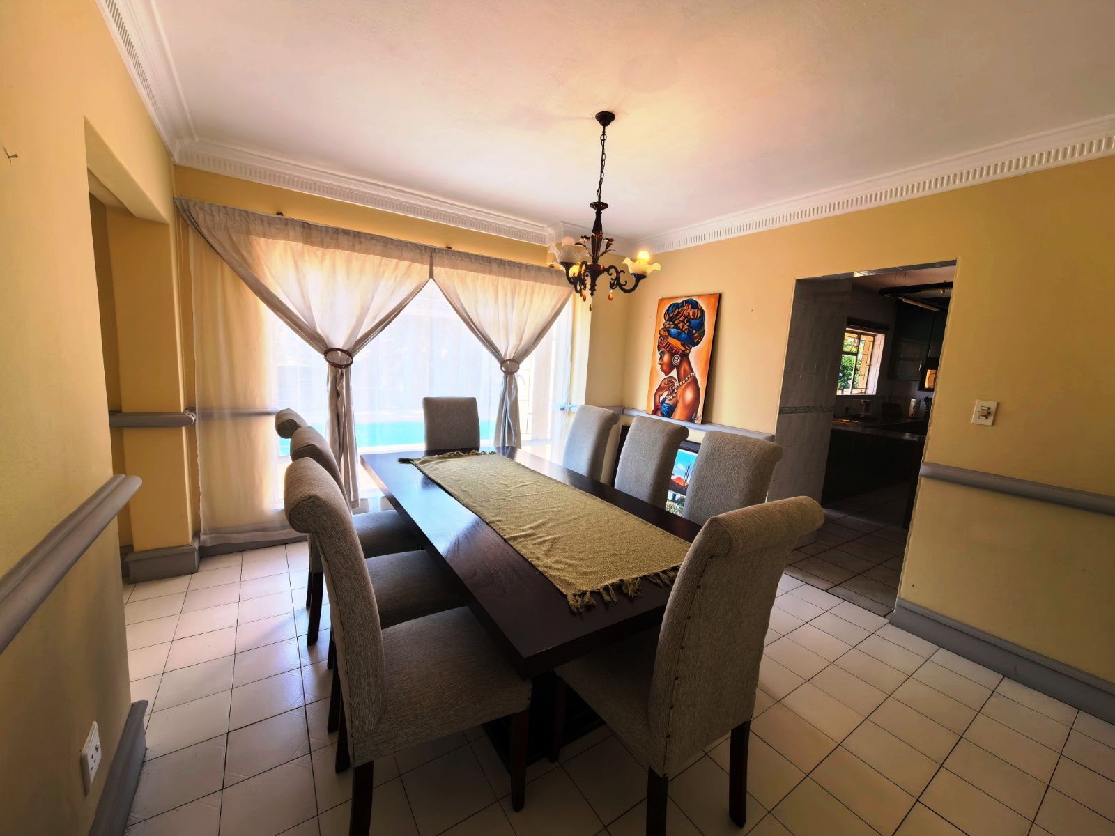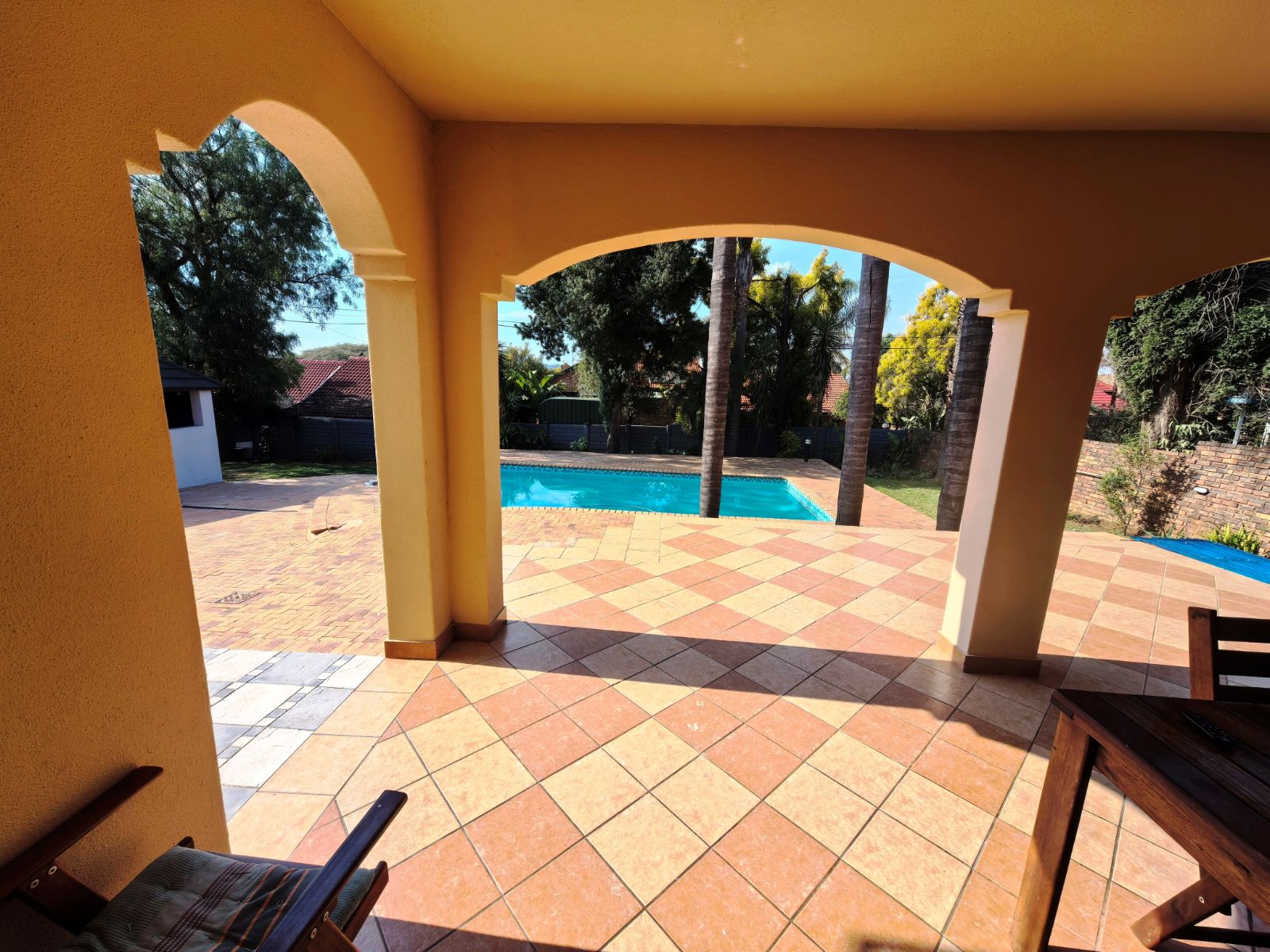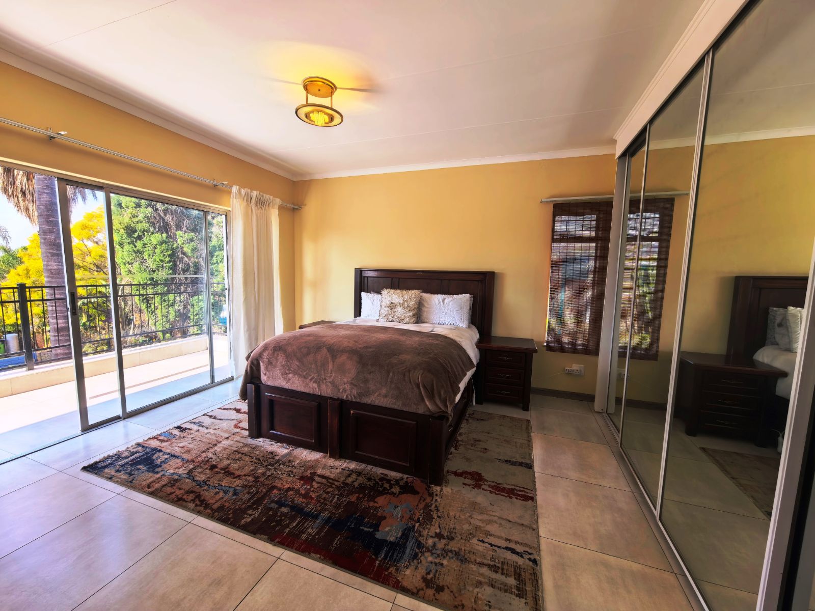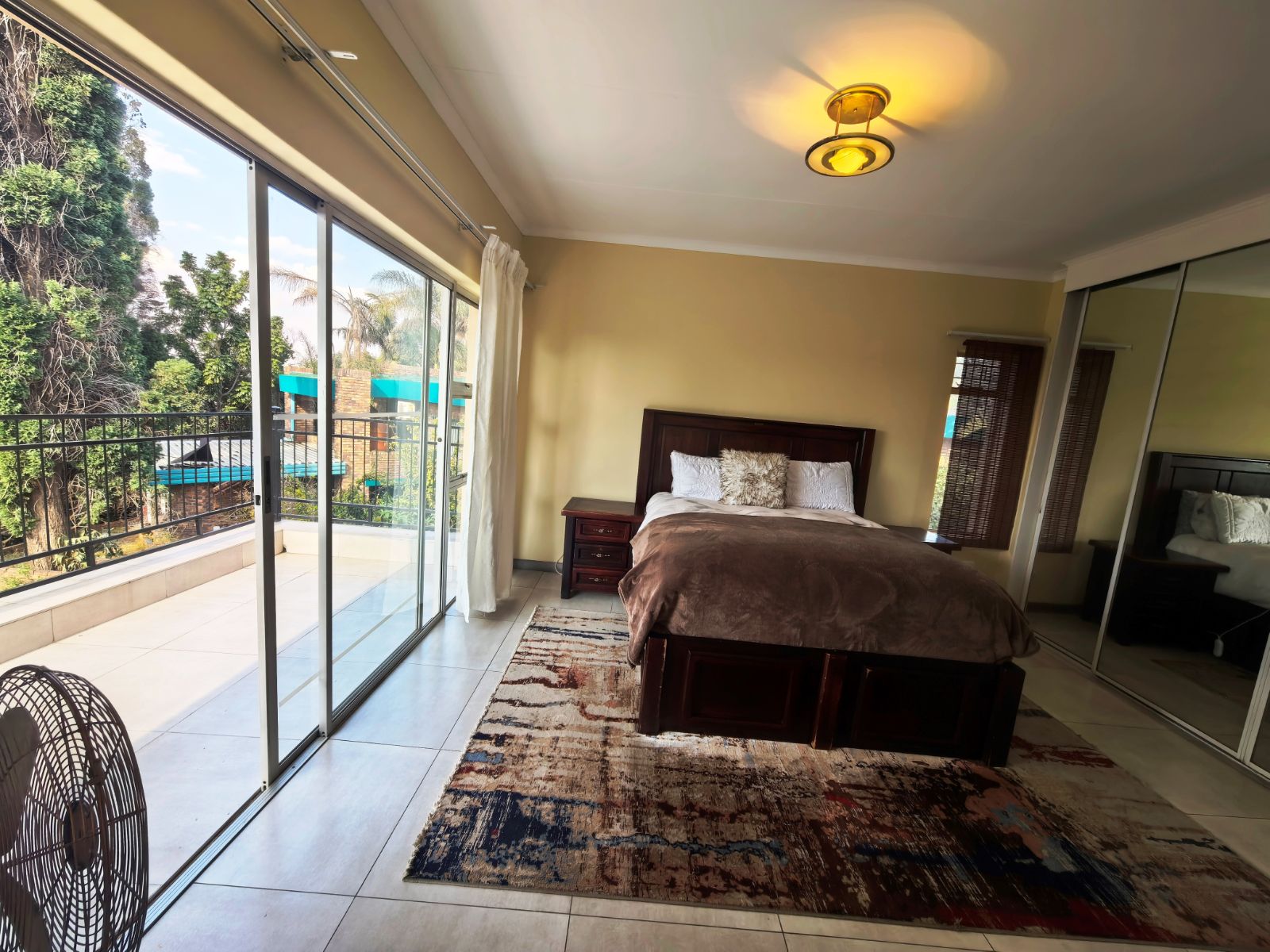 Inside, you are welcomed by a spacious living area that opens onto a covered patio with lovely views of the pool and entertainment area. The home offers three well-appointed living areas, a guest toilet, and a stylish kitchen with granite countertops, a separate scullery, and ample cupboard space. There's also a guest bathroom downstairs, along with direct access from the double garage into the house and additional storage throughout. Upstairs features four generous bedrooms, including a main suite with a full en-suite bathroom and a private balcony overlooking the pool, plus a second full bathroom serving the remaining bedrooms.