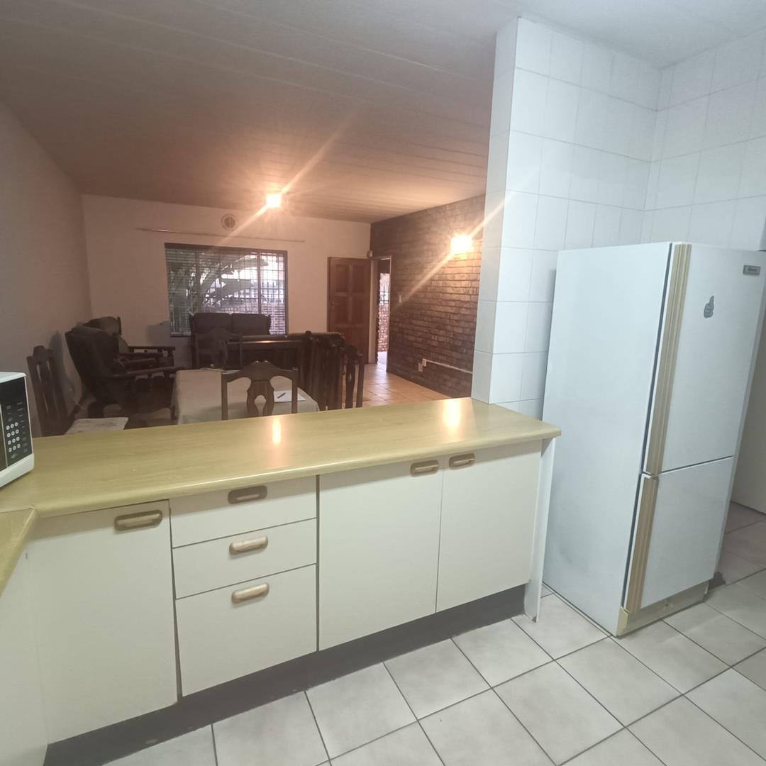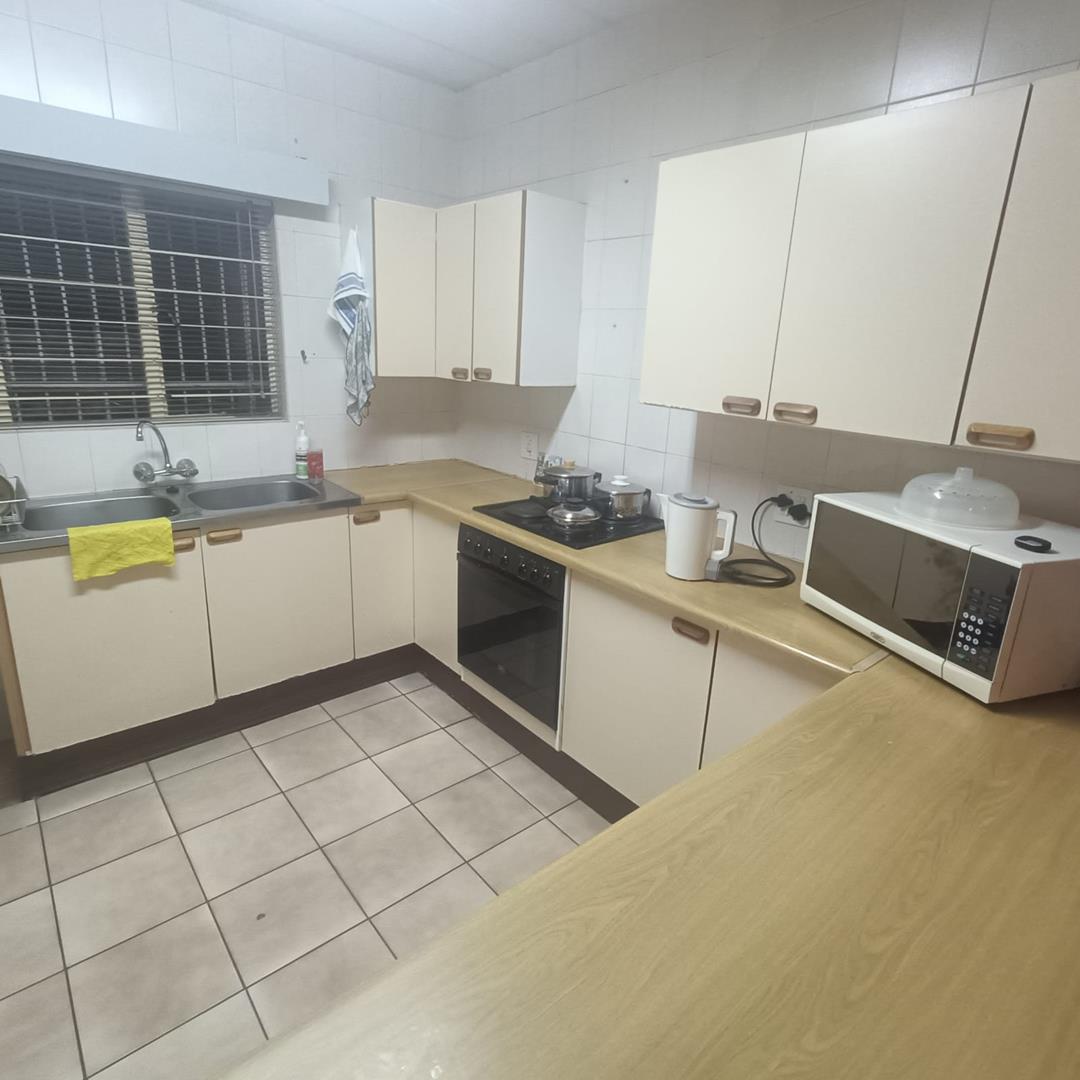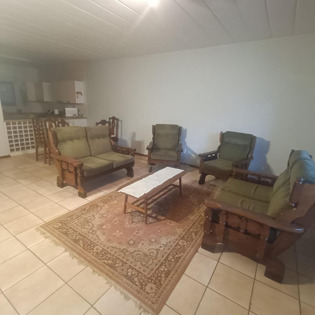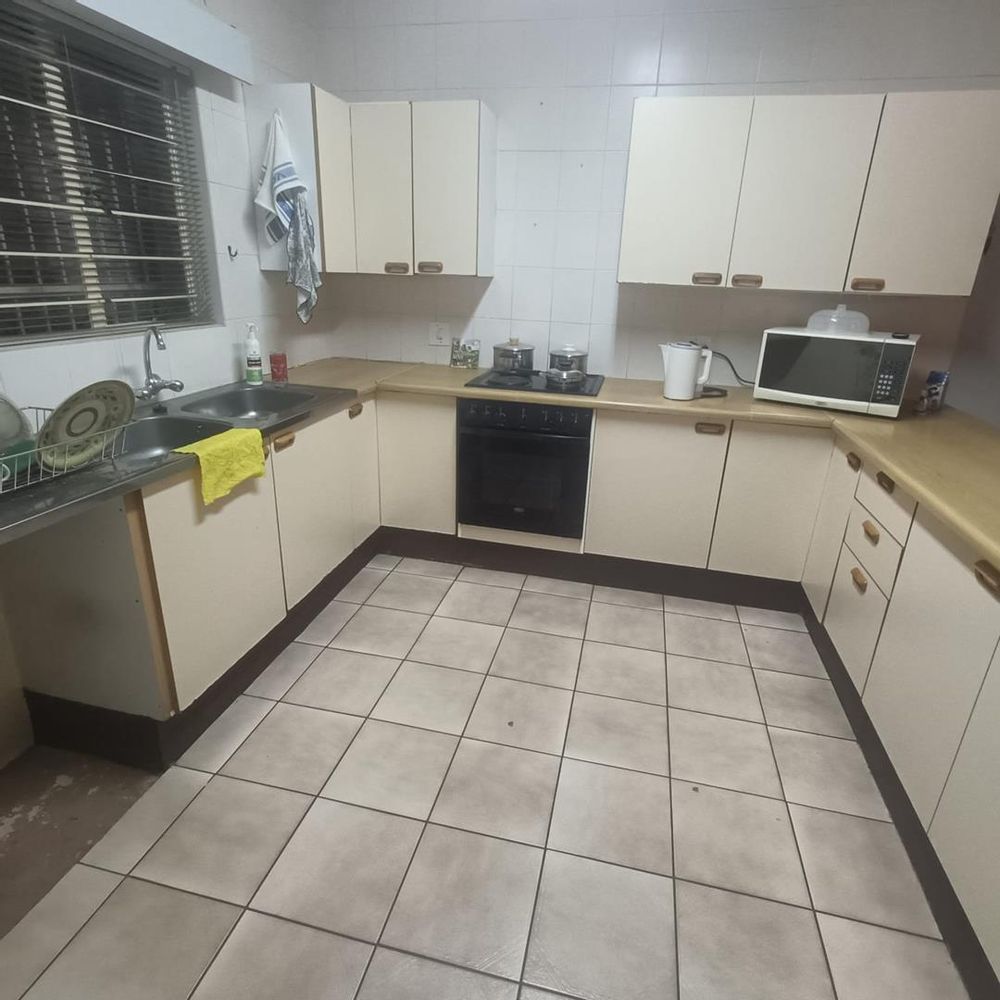 Open plan lounge and dining area with a big kitchen and closed up pantry.