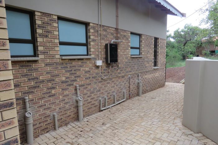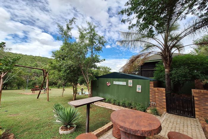 Bushveld retreat in Kranspoort Vakansiedorp — relaxed outdoor living with roaming antelope, golf and hiking access. Private braai entertainment area with splash pool; 3 beds, 2 baths.