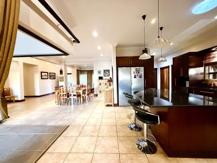 Entertainer's family retreat in Woodland Hills Wildlife Estate, north-facing with seamless indoor-outdoor flow to pool and boma. Includes cinema room, four bedrooms, three garages and staff accommodation.
