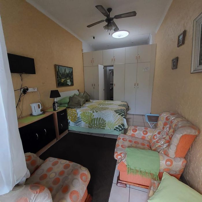 Entertainers' private garden oasis with thatched lapa and pool, plus enclosed braai area with shower. Cozy fireplace lounge, movable-island kitchen, spacious 4-car garage, three bedrooms.