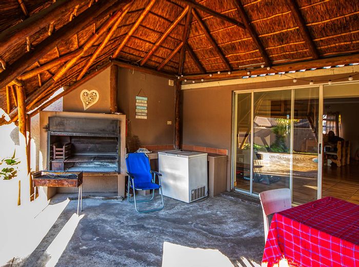 Entertainer’s dream in a sought-after neighborhood — thatched braai area overlooking pool, paved low-maintenance yard, large kitchen, single garage plus double carport; four bedrooms, two bathrooms.