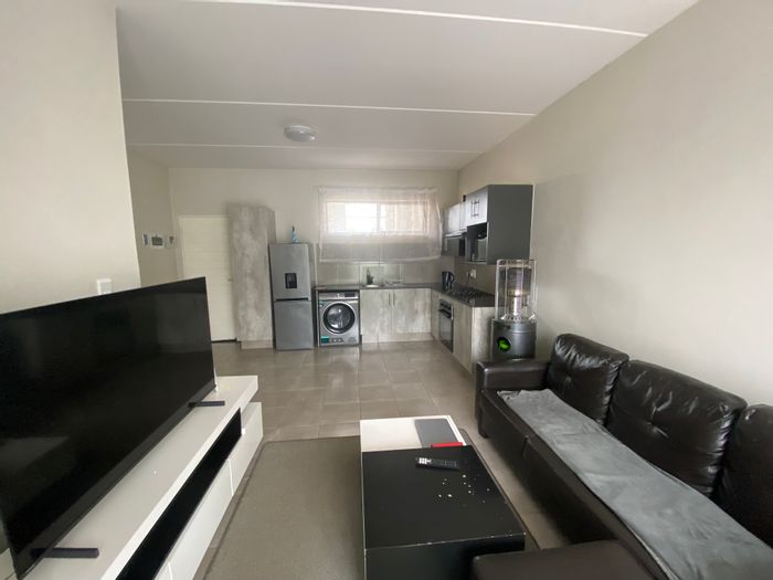 Ultra-modern ground-floor apartment in sought-after Rynfield, minutes from Linmed Hospital. Wrap-around Caesarstone kitchen with SMEG appliances, private walled garden, pet-friendly. Two bedrooms, two bathrooms, two covered bays.