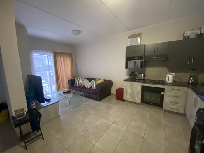 Convenient urban living in Rynfield, steps from hospital, schools and a paddle court & sports field; upstairs 2-bedroom apartment with balcony, open-plan kitchen, and covered parking bay.