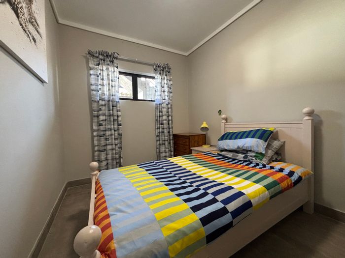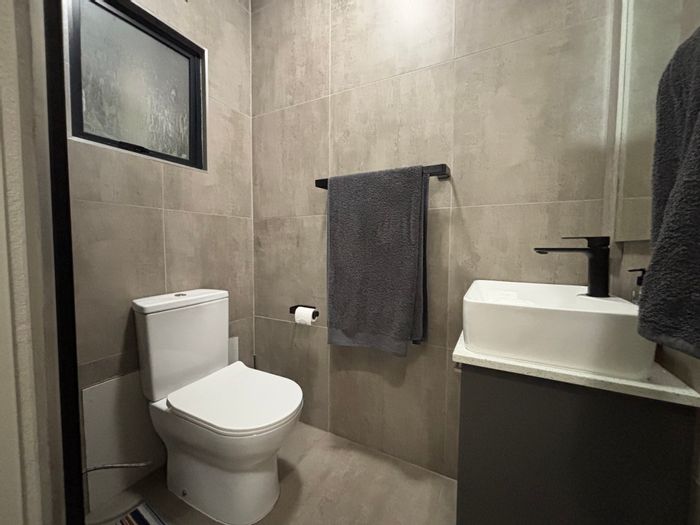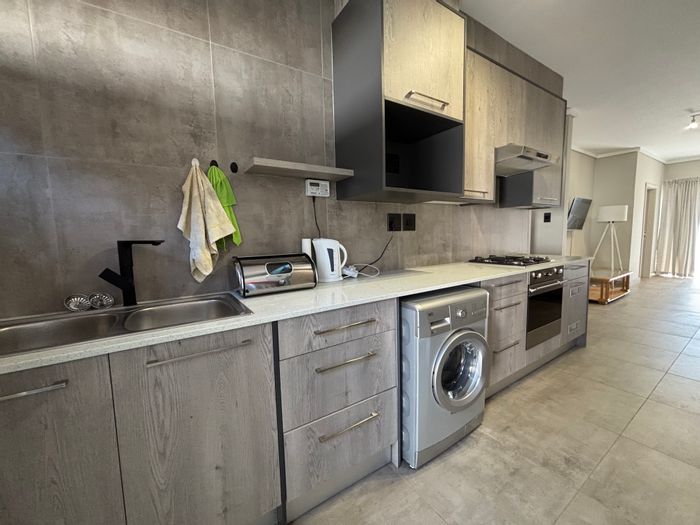 Entertain effortlessly in Rynfield's Waterside complex — private walled garden and covered patio with built-in braai, modern kitchen and solar geyser; 24-hour security, move-in ready with 2 beds, 2 baths.