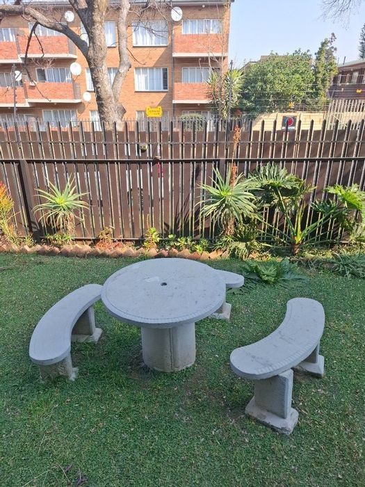 Ground floor lock-up-and-go unit with enclosed patio for dining or home office, in a complex with pool, braai areas and park benches near shops and transport, one bedroom, one bathroom.