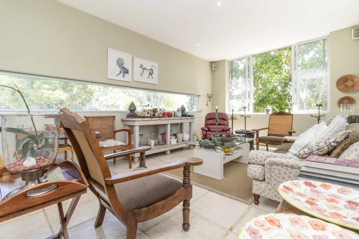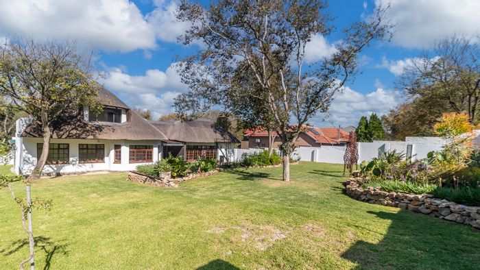 Thatched-roof sanctuary in Craighall Park near top schools and amenities, featuring a chef's kitchen with SMEG stove, alfresco courtyard, entertainer’s patio with built-in braai, plus income-generating cottage.