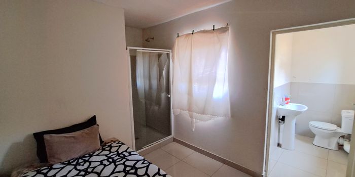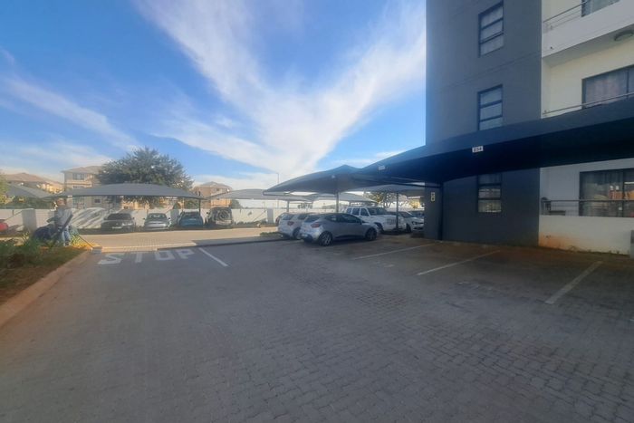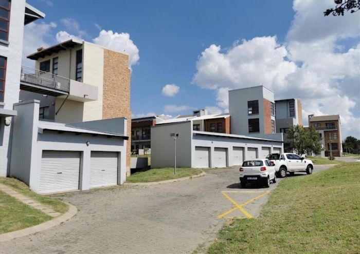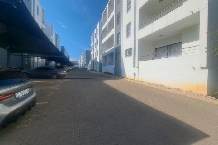Effortless Midrand living minutes from Mall of Africa and the N1, with a private balcony showcasing estate and skyline views, two bedrooms, one bathroom and two covered carports.