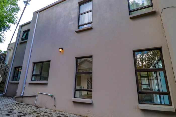 Convenient urban living near schools and the Gautrain, first-floor unit with open-plan living and communal pool; two bedrooms, two bathrooms, plus two covered and two open parking bays.
