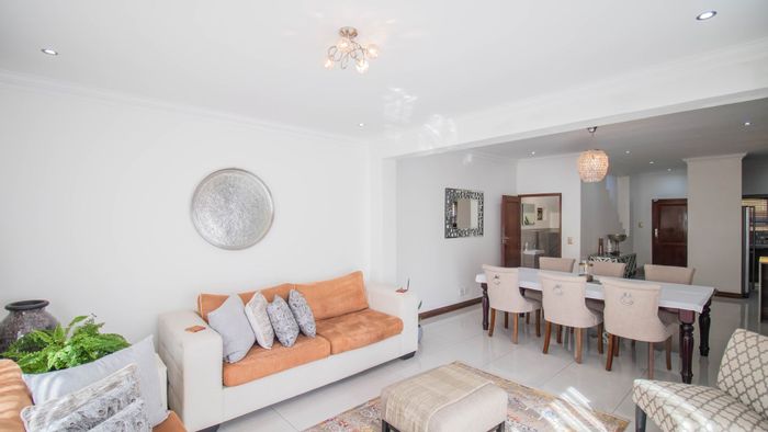 Sunlit cluster home in a 24-hour guarded complex, high ceilings and open-plan living flow to a manicured private garden with veggie plot; converted garage provides flexible 4th bedroom.