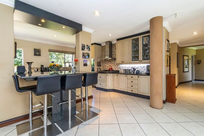 A stone's throw from the main park, this family oasis features a private landscaped garden, pool with built‑in braai and chef’s kitchen with island and scullery — five en-suite bedrooms.