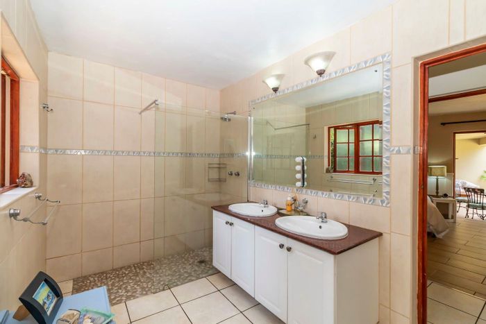 Entertainer's dream in Kyalami Estate, enjoying tranquil parkland and skyline views; covered balcony overlooks pool, wooden deck and boma. Five bedrooms, five bathrooms, double garage.