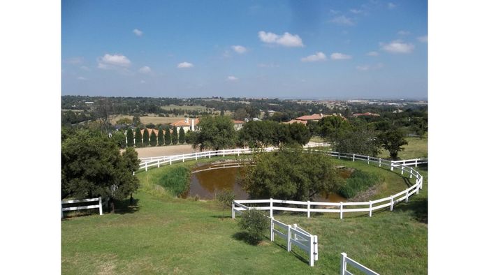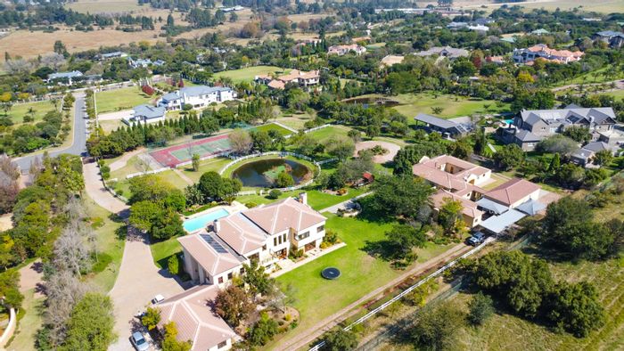 Country retreat in Saddlebrook with panoramic Sandton and Magaliesburg views, open-plan kitchen and enclosed entertainment area overlooking the pool, guest cottage and tennis court — seven beds, 4.5 baths.