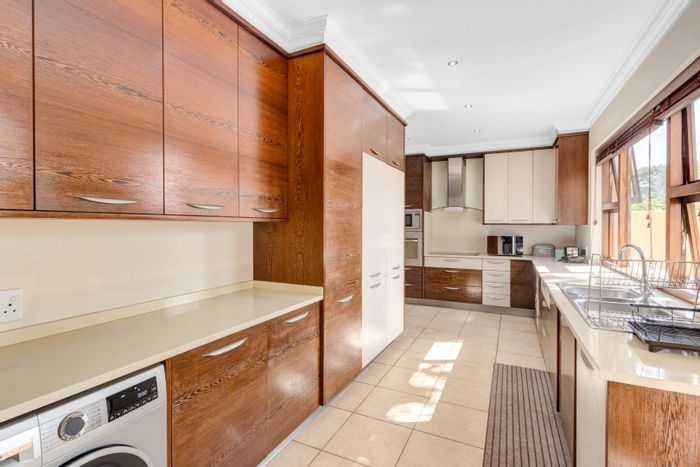 Entertain effortlessly with seamless indoor-outdoor living and Johannesburg skyline sunsets, featuring an enclosed patio with built-in braai and pool; four bedrooms, four bathrooms, triple garage.