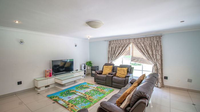 Entertainer's top-floor apartment in sought-after Eton Close, minutes from Mall of Africa — private balcony with built-in braai, backup battery, communal pool; 3-bed, 2-bath, double garage.