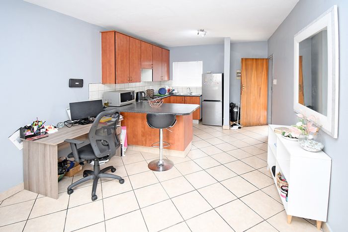 Enjoy vibrant Vorna Valley living steps from Mall of Africa — upstairs open-plan unit with modern kitchen and large balcony, two bedrooms, one bathroom, garage and pool.