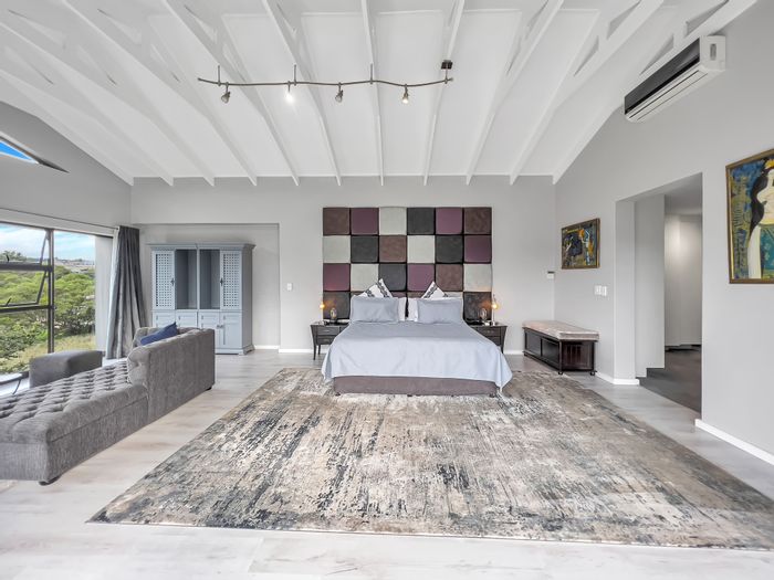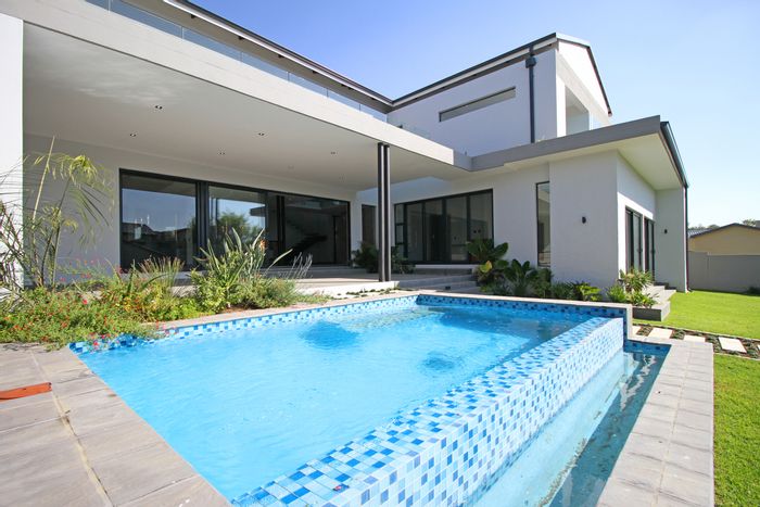 Secluded luxury in Waterfall Country Estate's Gate 6—indoors-outdoors living with water-feature entrance, rim-flow pool, covered braai patio, cinema and solar backup; five ensuite bedrooms.