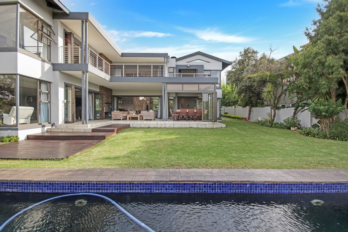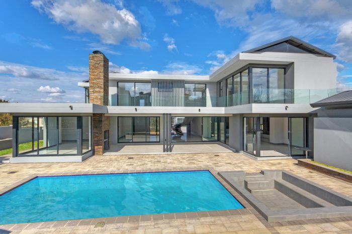 Entertainer's paradise in Waterfall Country Estate Gate 2 — heated pool, boma and covered braai patio, cinema room, multiple fireplaces and full home automation. Five en-suite bedrooms, four garages.