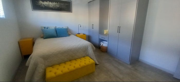 Lock-up-and-go apartment near major routes and shopping, featuring a contemporary kitchen, open-plan living with built-in braai, prepaid electricity and 24-hour security — two beds, two baths.