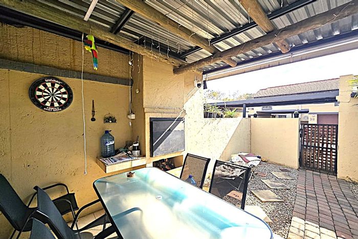 Entertainer's lifestyle in a secure complex close to shops and parks — open-plan living with sleek kitchen opening to a large garden and built-in braai. Two bedrooms, 1.5 baths.