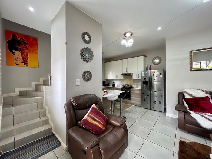 Storybook loft living in Equestria — sunlit upper bedrooms with roofline windows, ground-floor main ensuite, open-plan kitchen with pantry, private garden and built-in braai; secure complex — 3 beds, 2 baths.